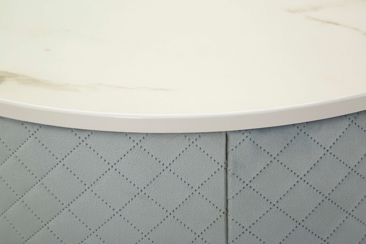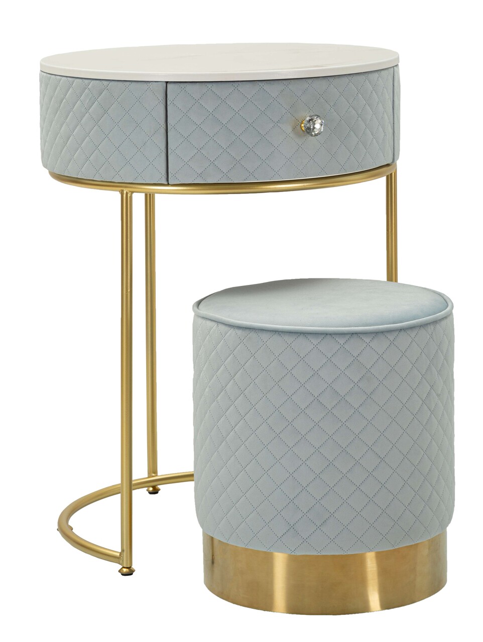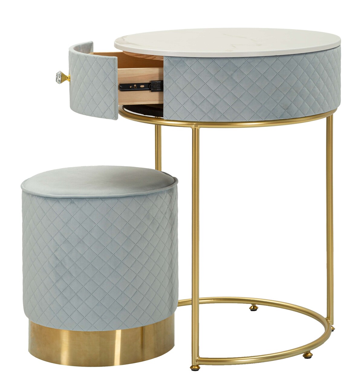 Aceasta masuta cu taburet inclus impresioneaza prin tonurile proaspete de bleu pastel si liniile elegante. Un accesoriu perfect pentru spatiile de beauty sau dormitoare decorate in stil delicat si contemporan. Dimensiuni interioare sertar: 30x30x8 cm.