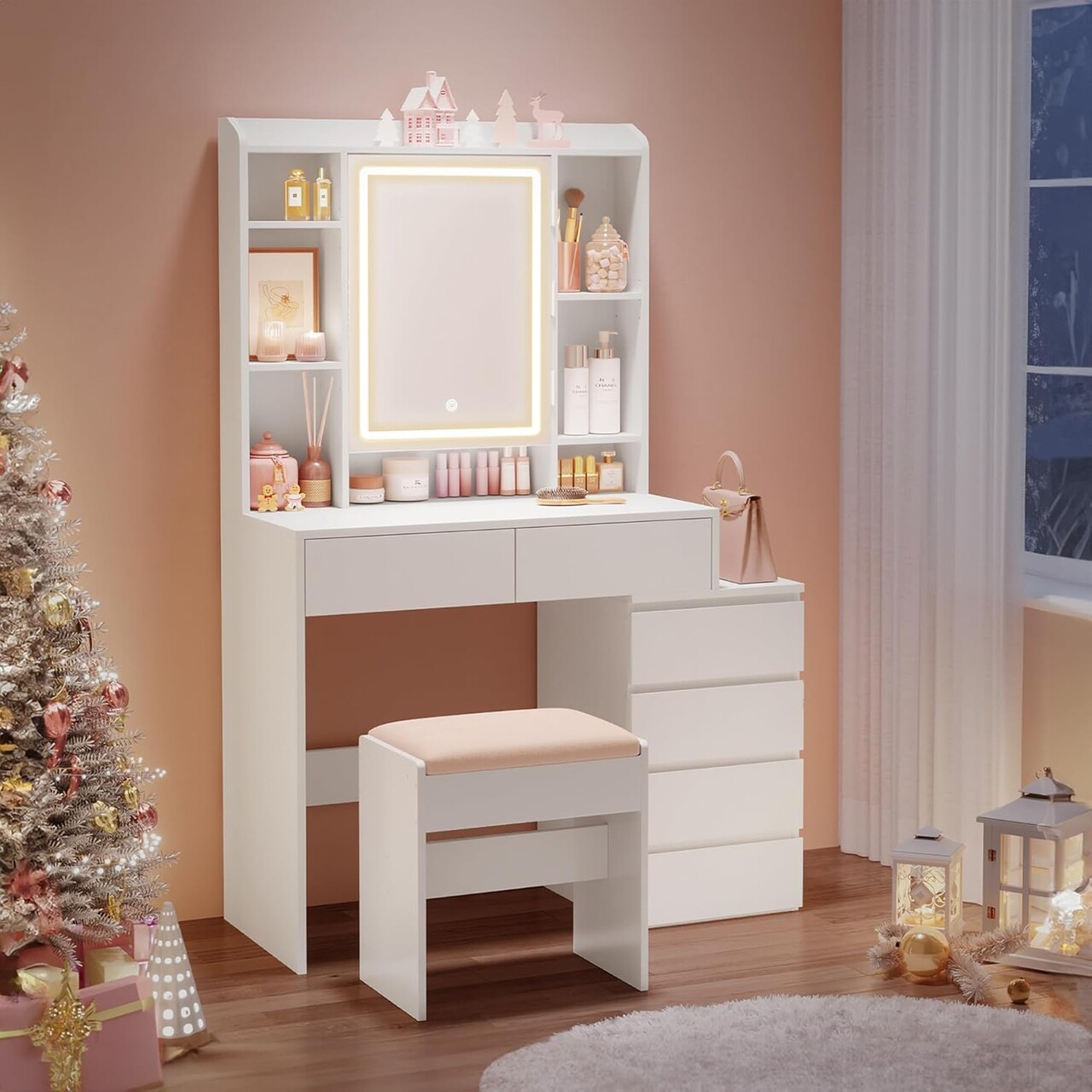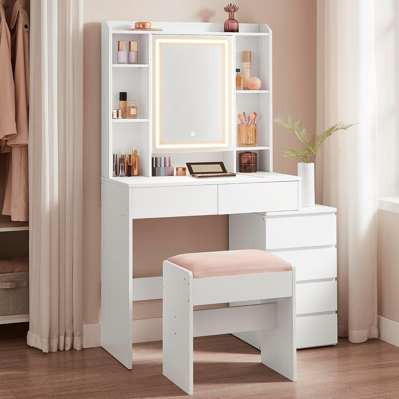 Masa de toaleta cu taburet si oglinda cu LED-uri / masuta dressing, Vasagle, 80s40s137.5 cm, MDF, alb