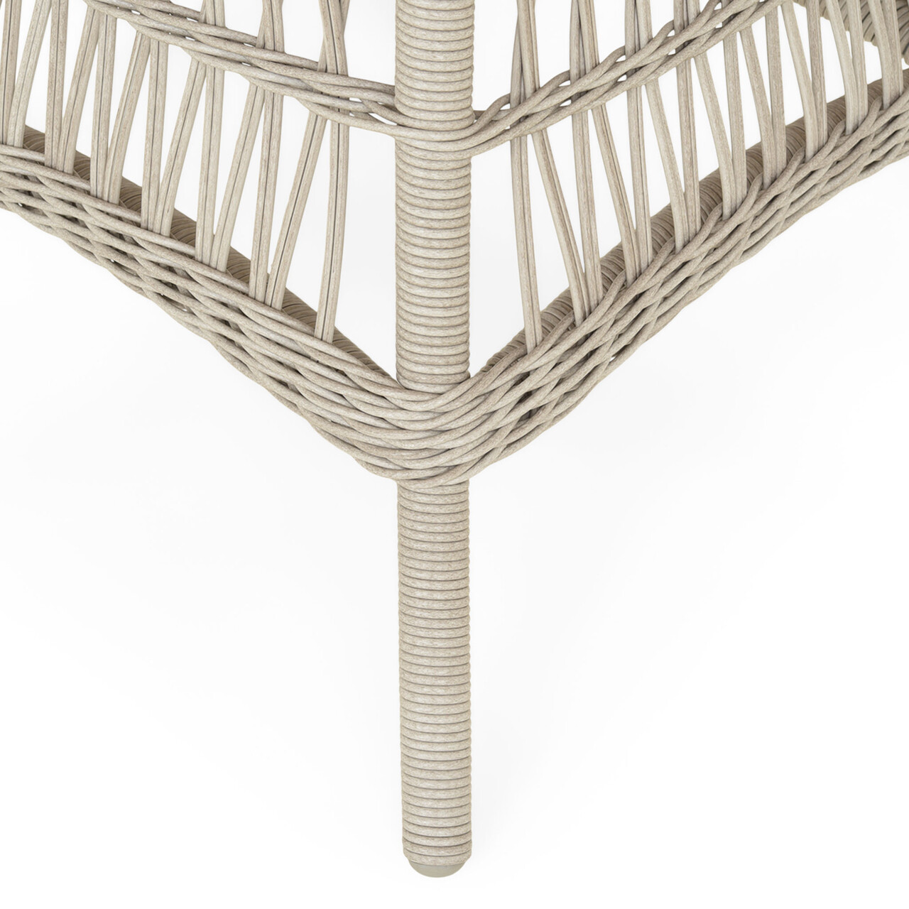 Realizata din structura solida de aluminiu vopsita in camp electrostatic si impletita cu fibre sintetice tip 'round wicker' cu protectie UV 3000h ce imita ratanul. Topul este realizat din lemn de teak.