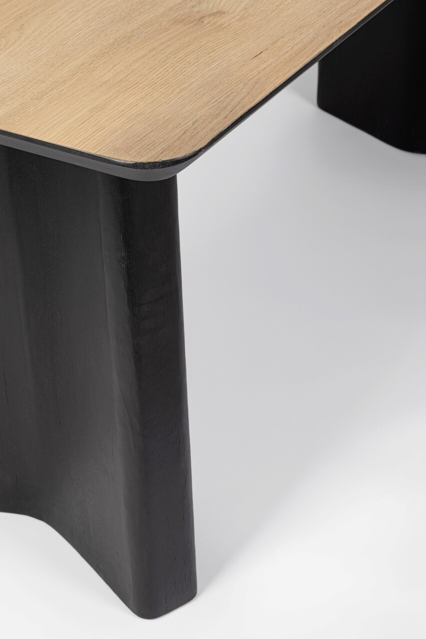 MDF, furnir de stejar. Finisare naturala cu vopsea pe baza de apa pentru blat, finisare pe baza de nitroceluloza pentru picioare.