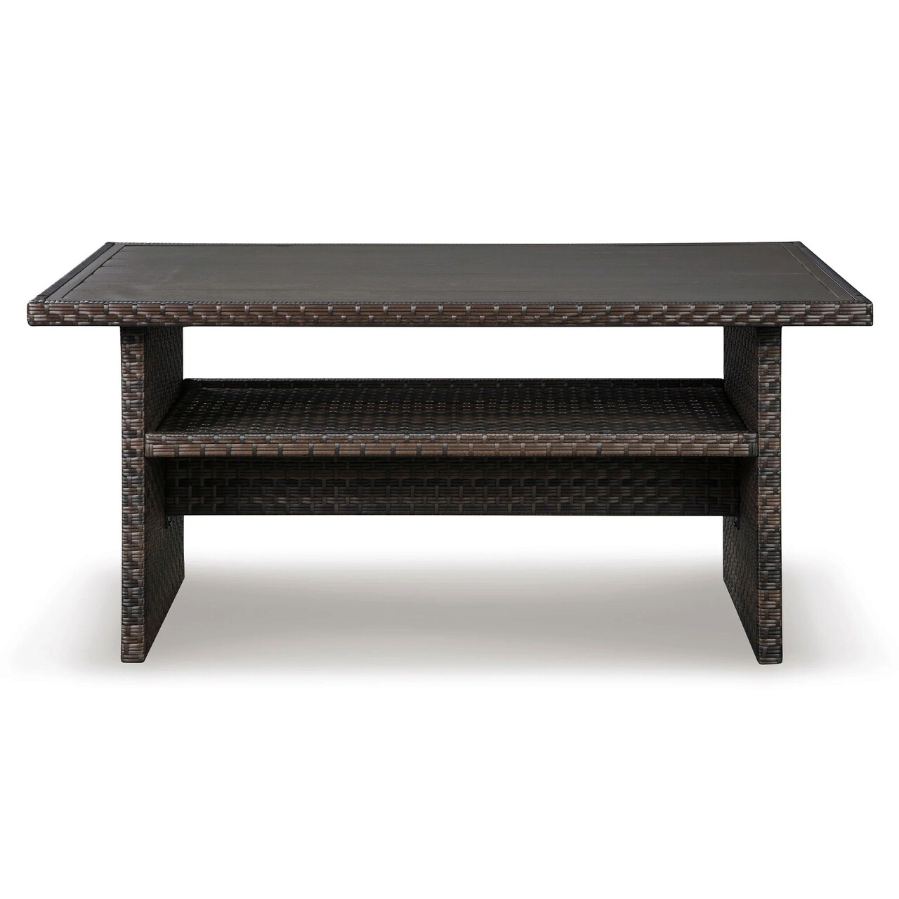 Realizata din structura solida de aluminiu impletita cu fibre sintetice ce imita ratanul cu protectie UV. Topul mesei este realizat din imitatie lemn (polywood).