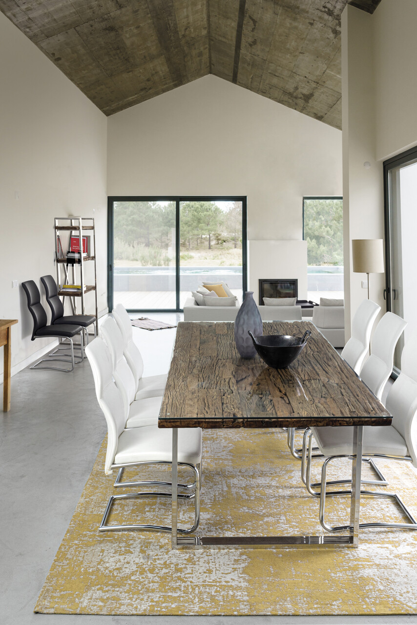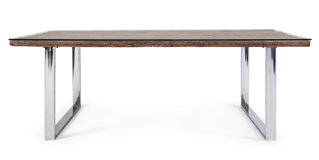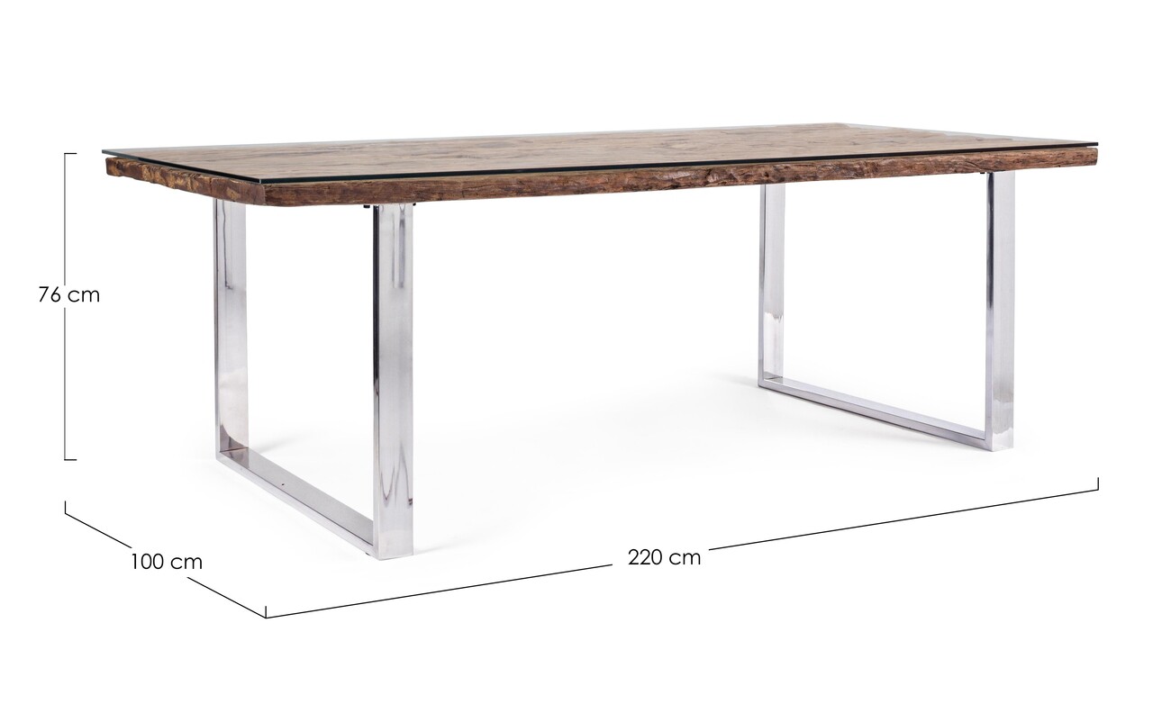 Masa Stanton, Bizzotto, 220x100x76 cm, 8 locuri, lemn reciclat/sticla temperata/inox