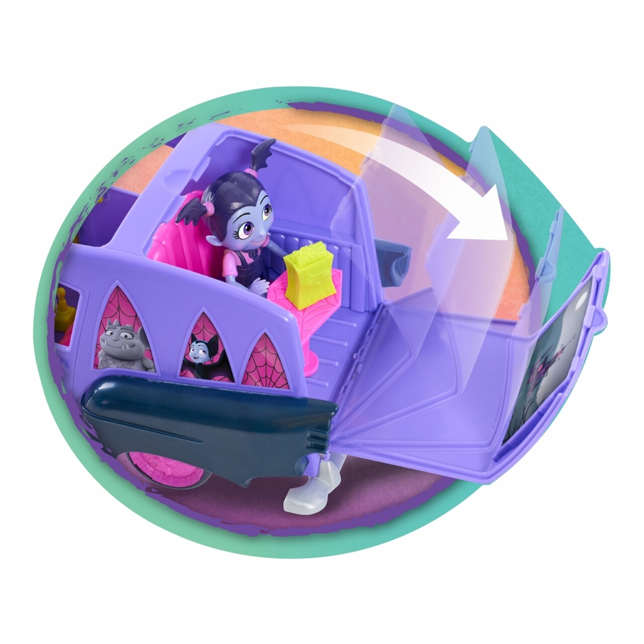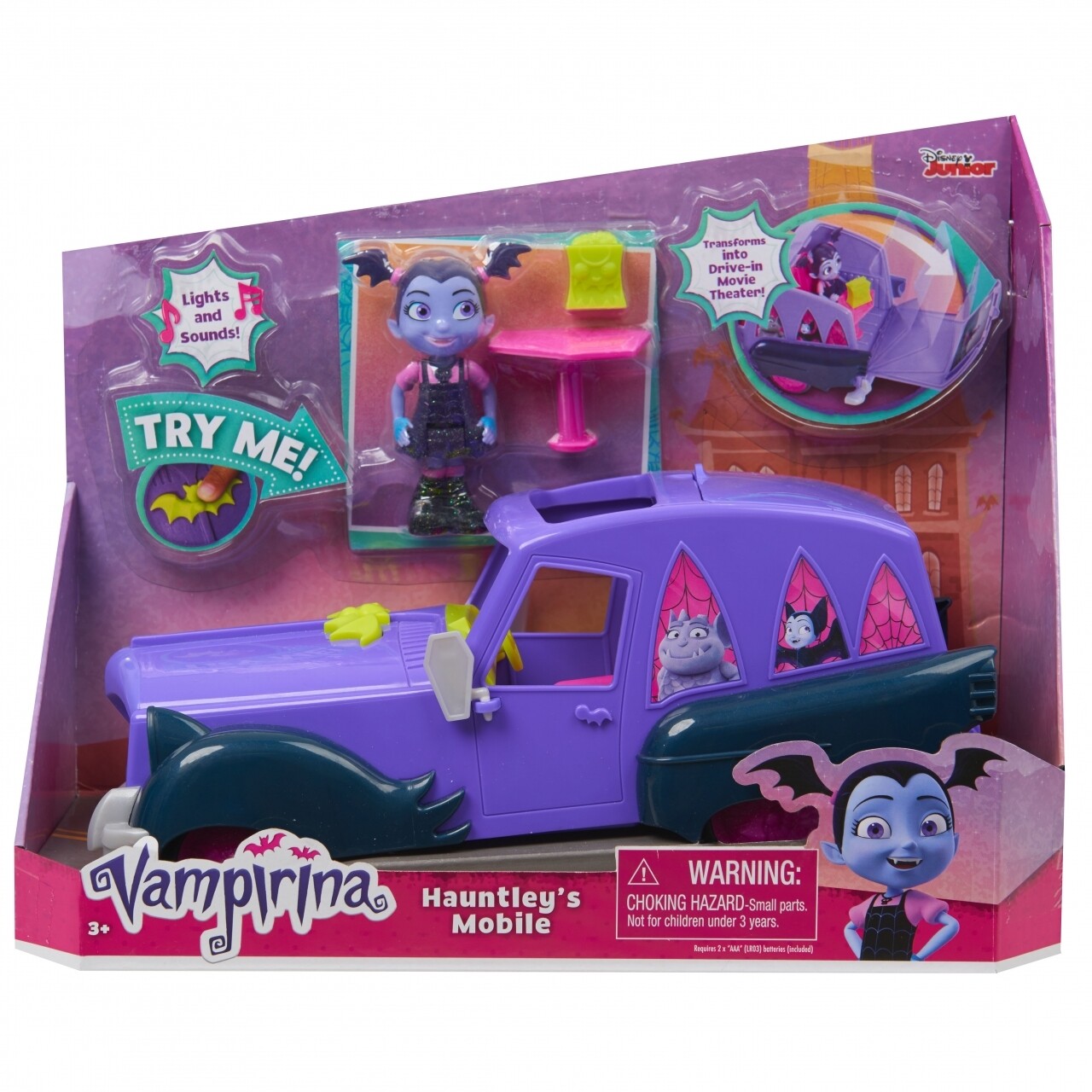 Cum e oare sa te muti la o scoala noua, intr-un oras nou, ba chiar intr-o alta tara, printre oameni… daca esti vampir? Familia Vampirinei e foarte prietenoasa, insa ea se teme ca nu va fi acceptata de colegi sau vecini pur si simplu pentru ca e altfel. Dar poate ca, pe langa firea ei sincera si generoasa, tocmai aceste deosebiri o fac speciala… Vampirina este o mica vampirita a carei familie se muta in Pennsylvania, unde vor administra o pensiune pentru vampiri si spiridusi. Intra in lumea noului tau personaj preferat Vampirina achizitionand masina acesteia. masina Vampirinei se transforma intr-un cinematograf. Apasati butonul de pe capota masinii si activati efectele luminoase si sonore. Cuvintele reproduse sunt in limba engleza.