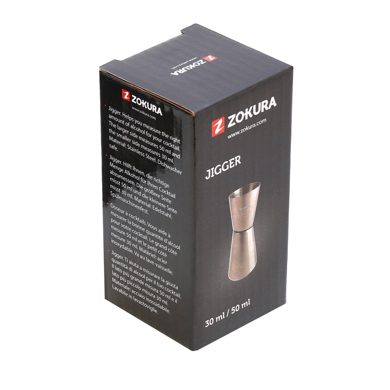 Masura dubla pentru bauturi (Jigger), Marca Zokura, Din Inox 304 cu grosimea de 0,5 mm, Capacitate 30 si 50 ml.