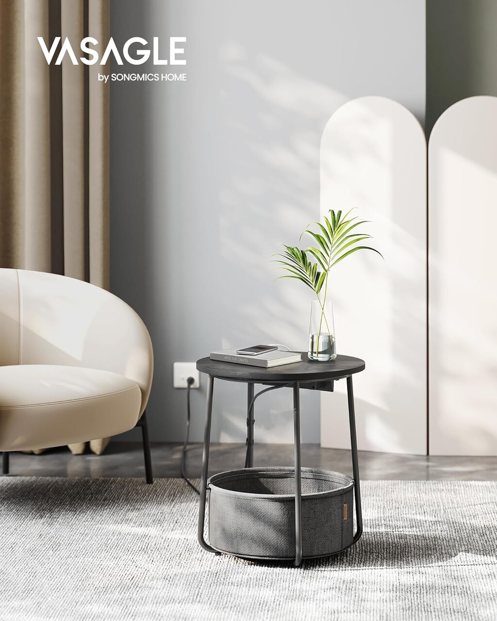 Masuta cu cos textil, priza si USB, Vasagle, 45x50 cm, max 35 kg, PAL/otel, negru/gri ardezie