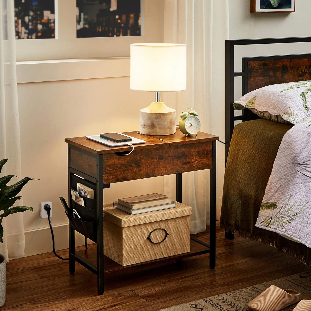 Masuta cu priza, USB si blat pliabil Vasagle, 60 x 31.5 x 60 cm, PAL/otel, maro rustic