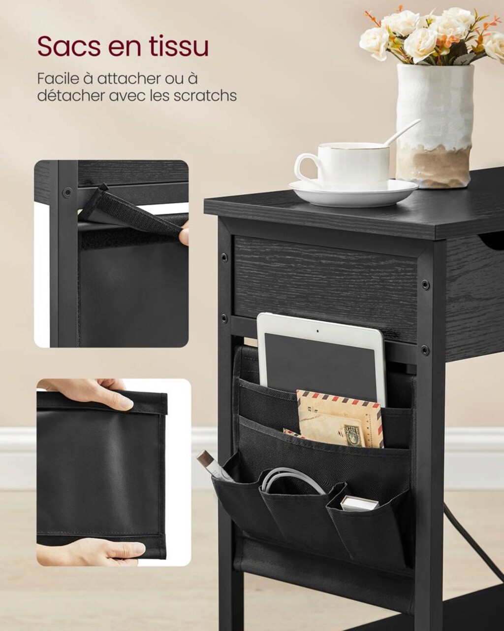 Masuta cu priza, USB si blat pliabil Vasagle, 60 x 31.5 x 60 cm, PAL/otel, negru