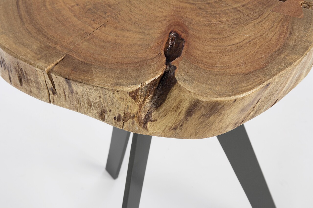 Blat din lemn de salcam (sectiuni de bustean), picioare din otel acoperite cu pulbere epoxidica. Finisaj cu vopsea poliuretanica.