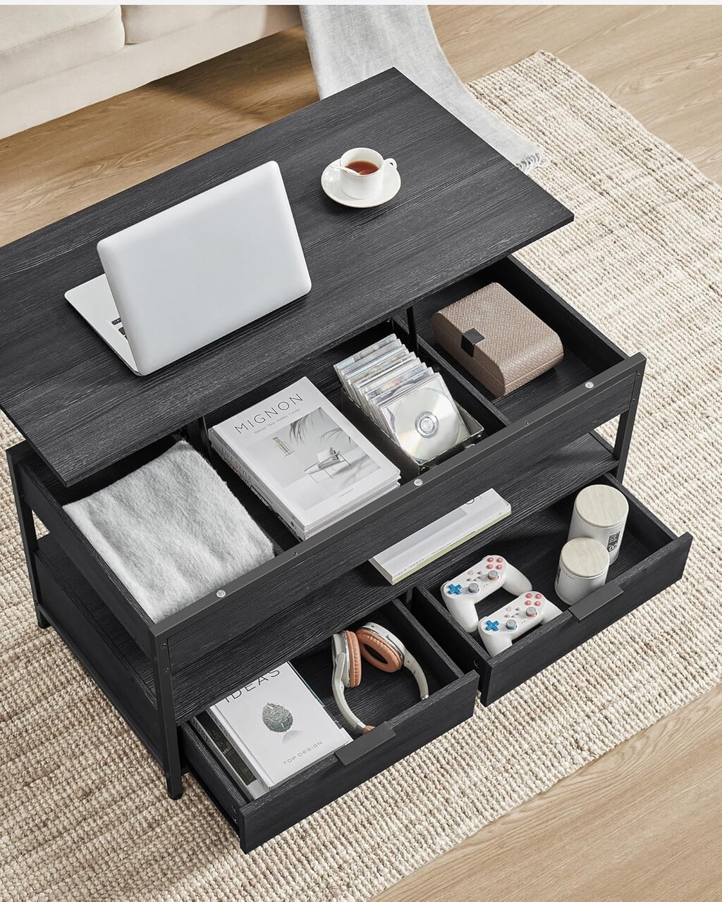 Mult spatiu de depozitare: Suprafata mare a mesei si raftul inferior ofera spatiu de depozitare deschis pentru lucrurile necesare zilnic. 3 compartimente ascunse si 2 sertare organizeaza paturile, revistele si alte obiecte mici.
