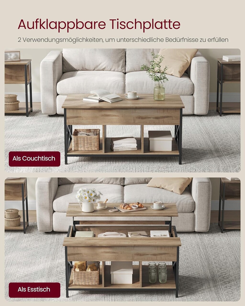 Masuta de cafea cu blat rabatabil Vasagle Lift-Top, 100 x 60 x 48-62 cm, PAL/otel, maro rustic/negru