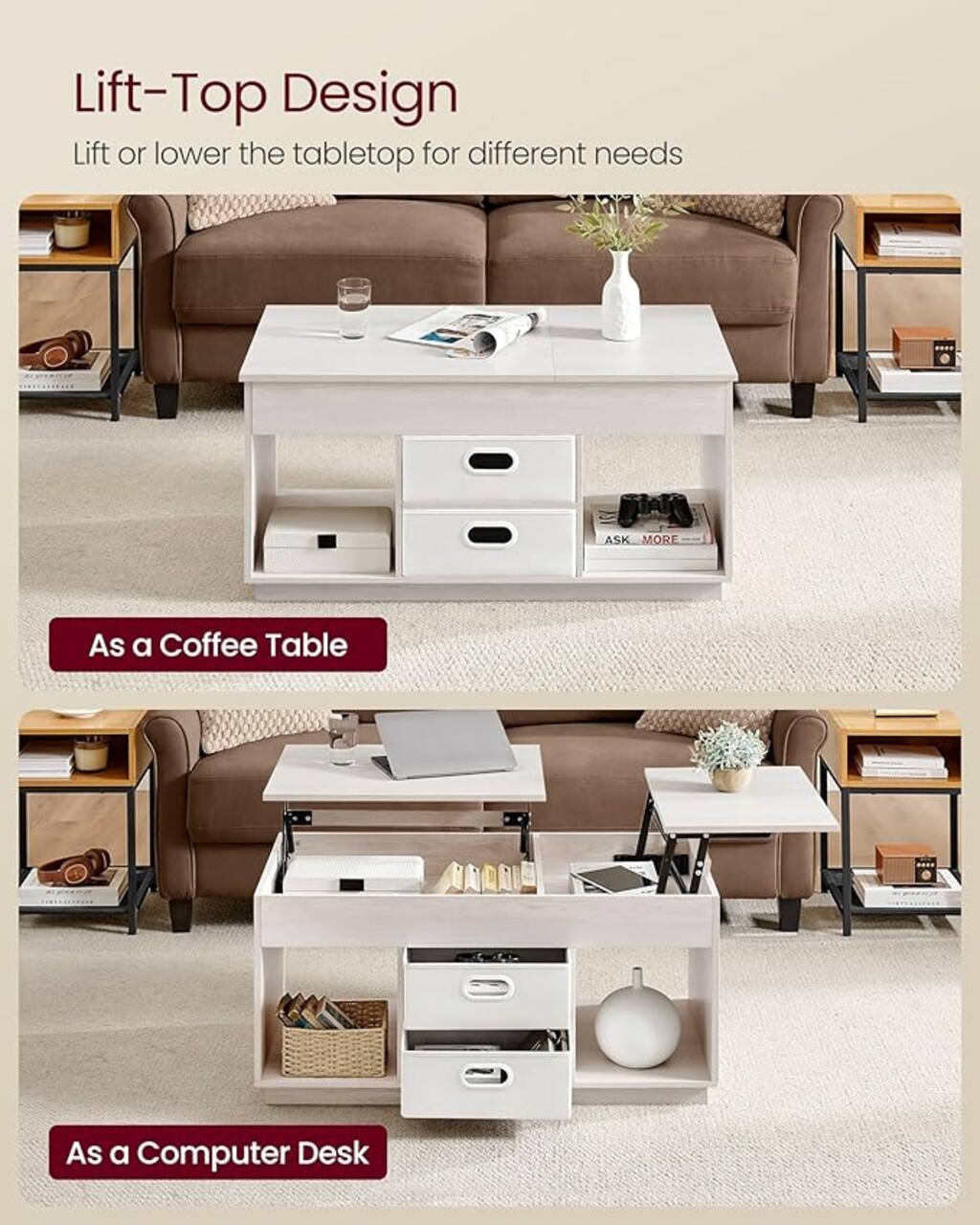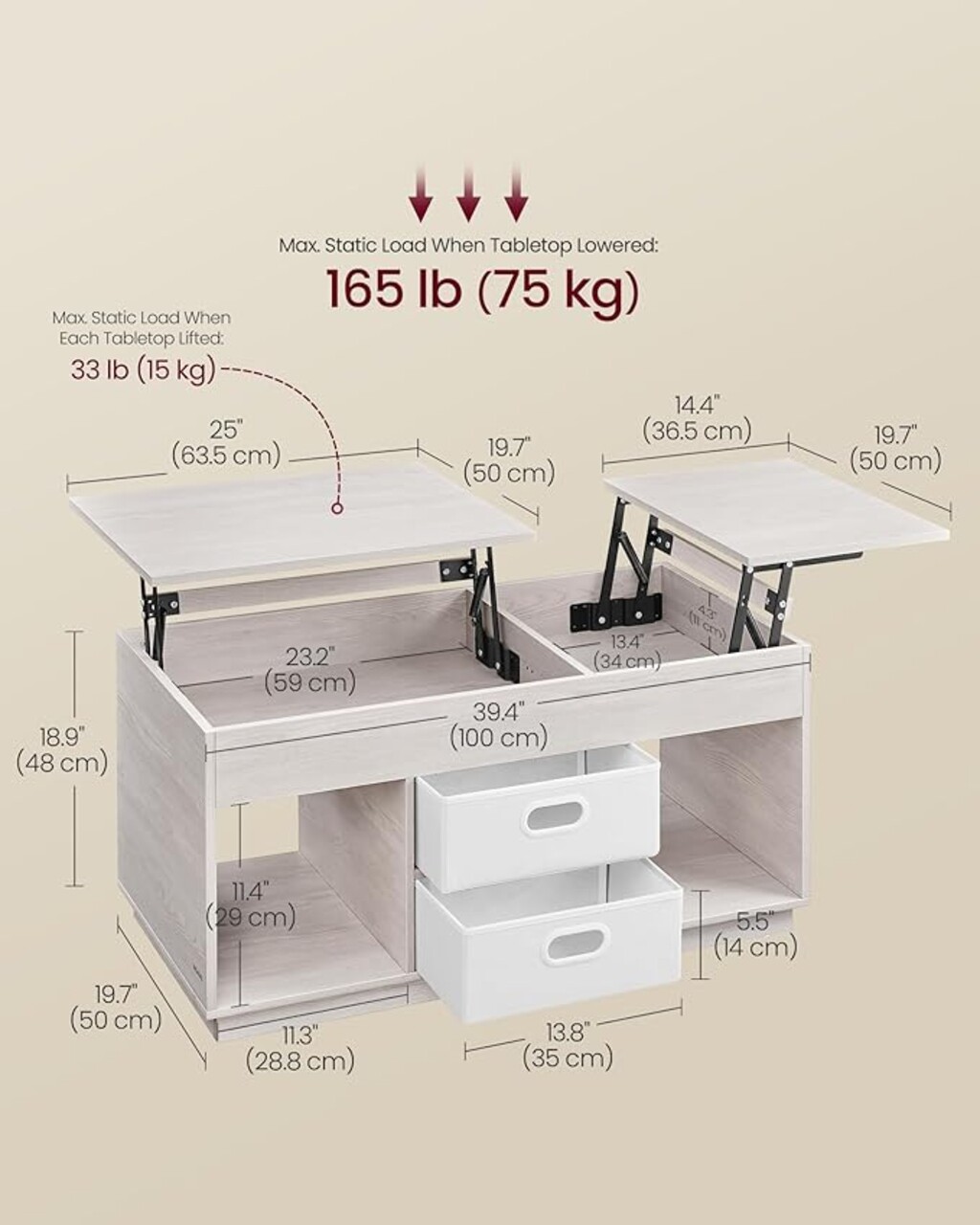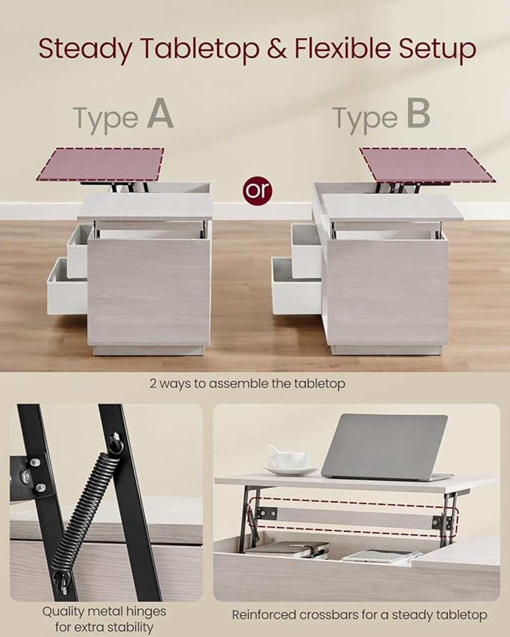 Masuta de cafea cu blaturi rabatabile, Vasagle Lift-Top, 100x50x48-62.3 cm, PAL/otel, bej