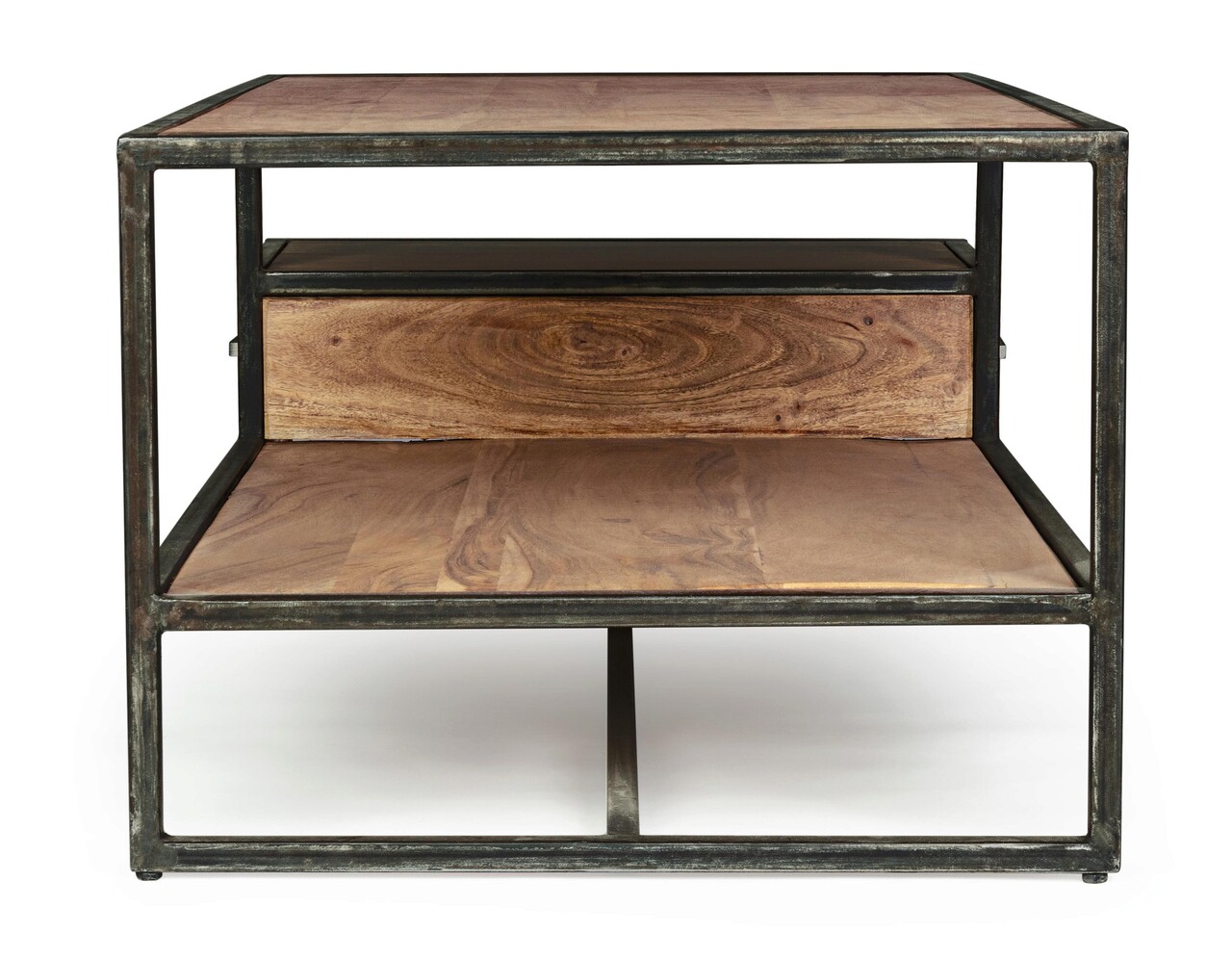 Cadru din lemn de salcam si otel acoperit cu pulbere epoxidica, spate din placaj. Finisaj acrilic de protectie. Manere din otel.