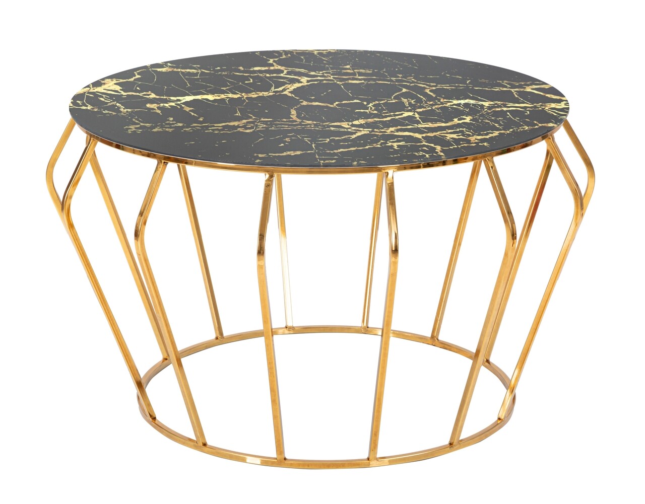 Masa de cafea rotunda din metal auriu cu blat din sticla cu prelucrare asemanatoare marmurei. Designul liniar si contrastul dintre auriu si negru creeaza un efect elegant si deosebit de stilat.