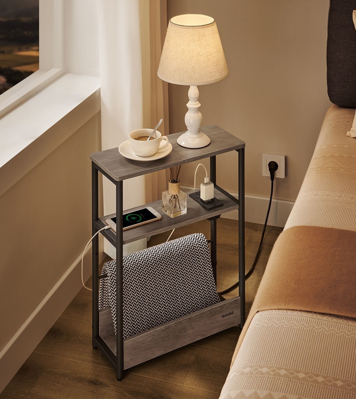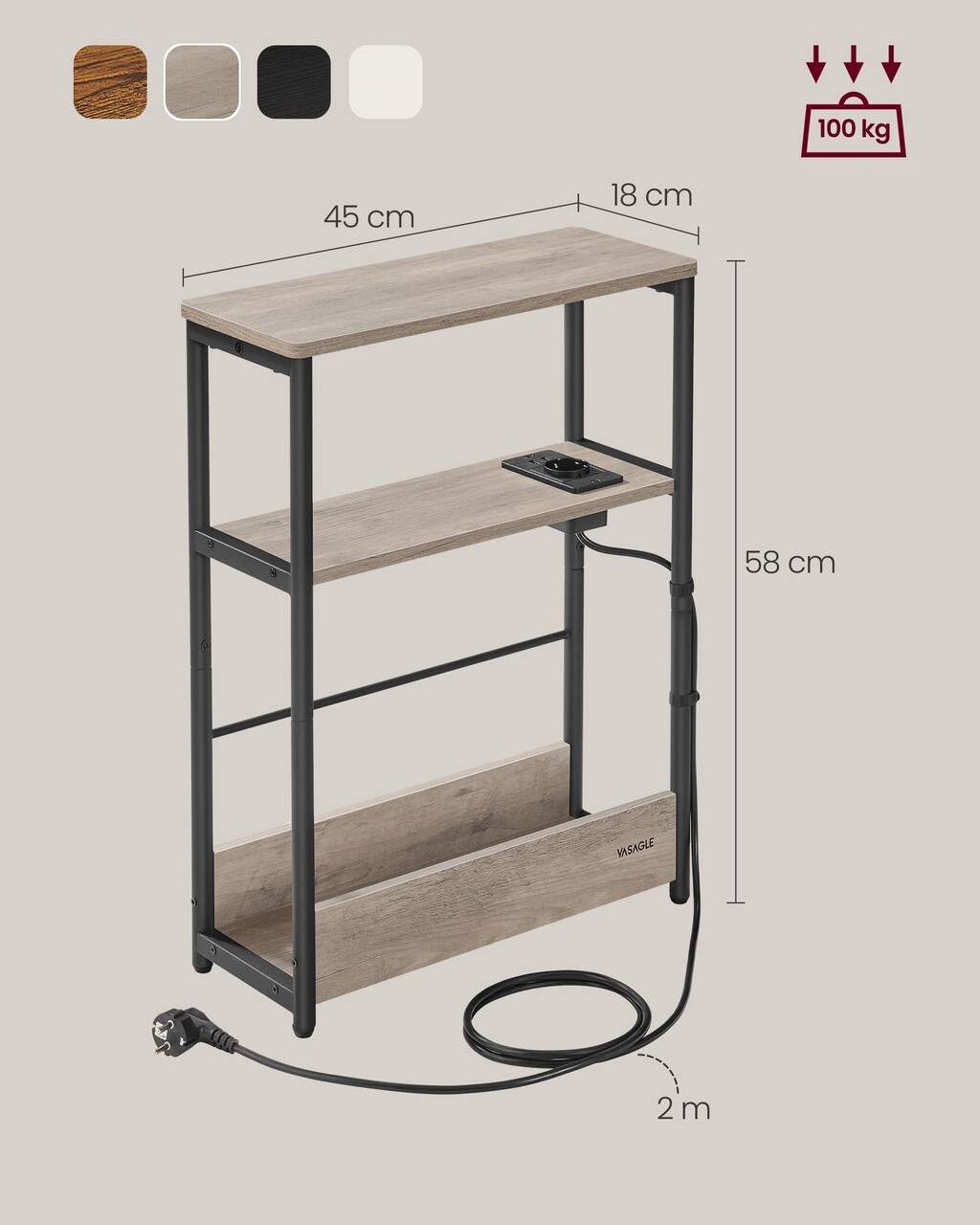 Masuta de cafea ingusta cu priza si USB Vasagle, 45x18x58 cm, max 100 kg, PAL/otel, gri