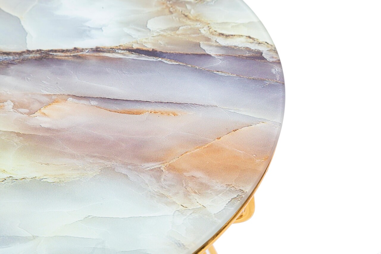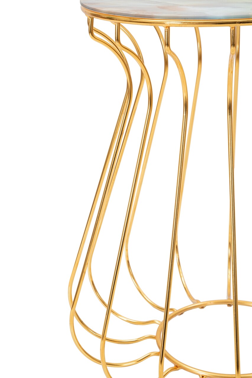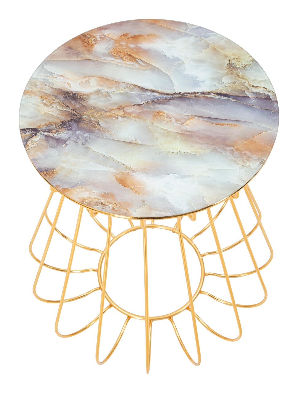 Masuta rotunda mica din metal auriu cu blat din sticla cu prelucrare asemanatoare marmurei. Designul geometric combinat cu aurul si coloritul deosebit al blatului creeaza un contrast delicat, plin de clasa si eleganta.