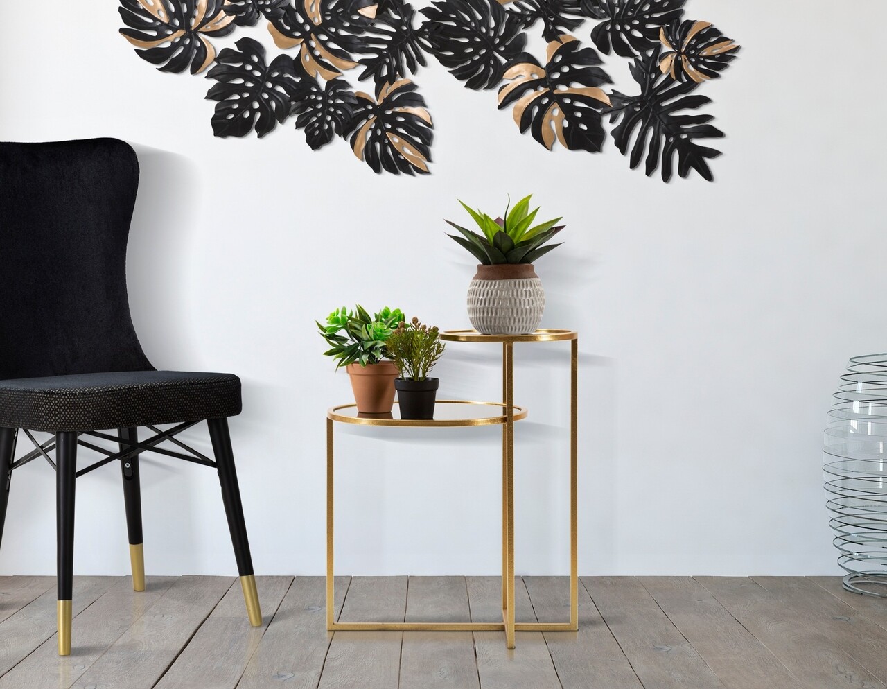 Masuta de cafea pe doua niveluri cu structura metalica aurie si linii geometrice. Cele doua blaturi sunt realizate din sticla.