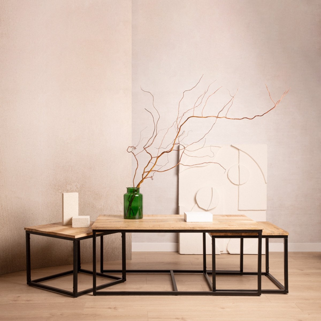 Setul de masute de cafea MAYA este cu siguranta o alegere eleganta si versatila! Designul minimalist, cu un cadru metalic si blat din lemn masiv de mango, creeaza un look modern si rafinat. Cele trei mese pot fi folosite impreuna pentru a crea o compozitie impresionanta sau separat, oferind flexibilitate in amenajarea spatiului. Picioarele de nivelare sunt o caracteristica practica, asigurand stabilitatea pe orice tip de suprafata.