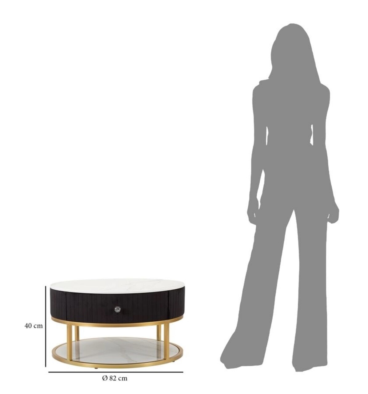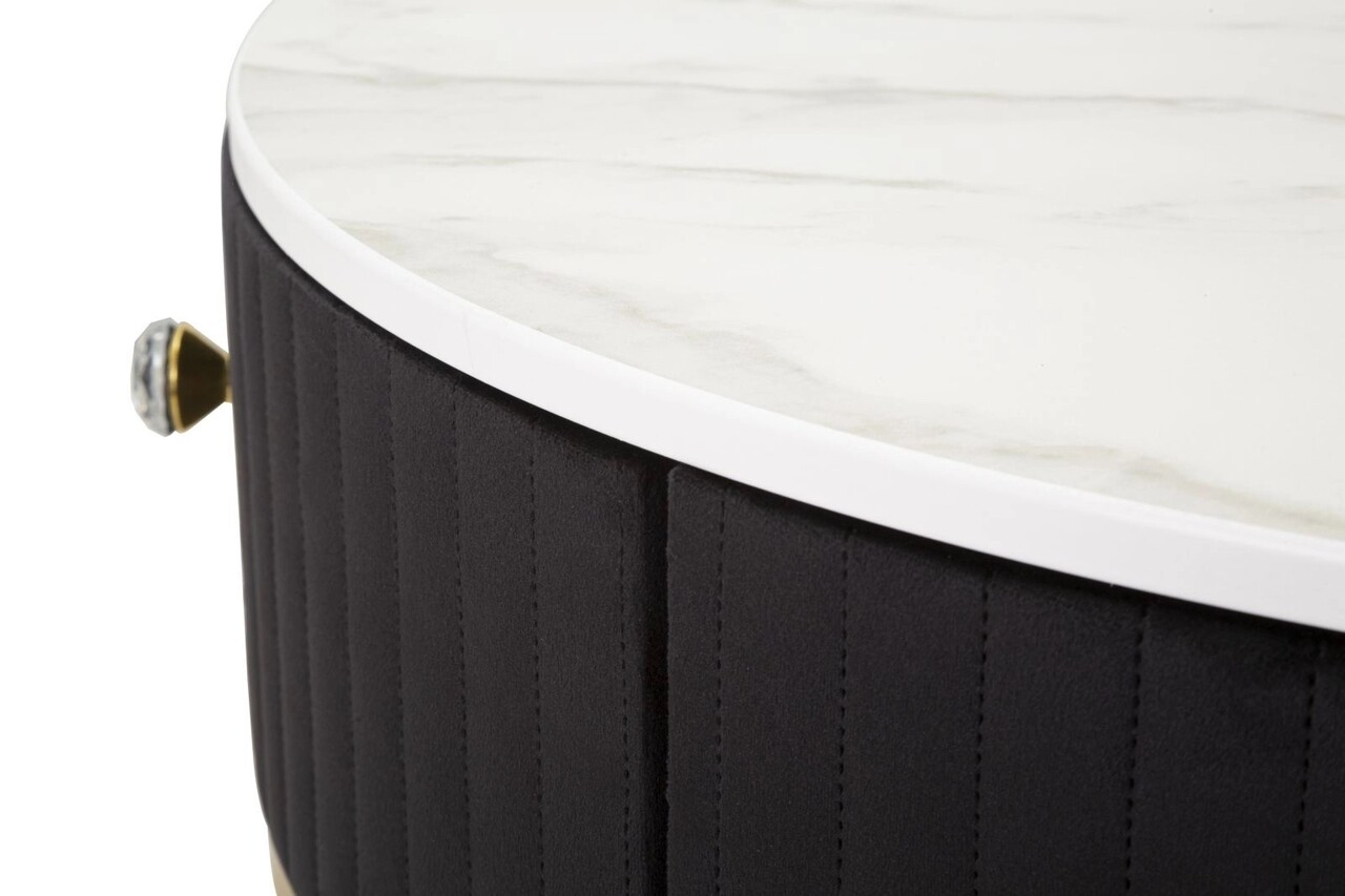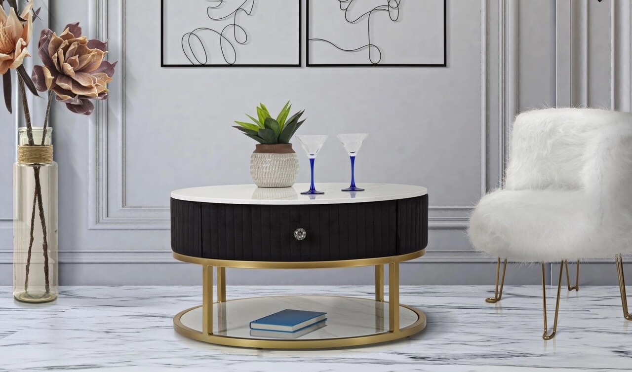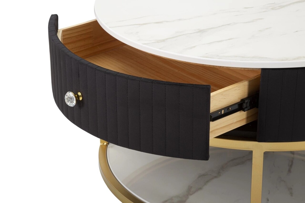 Masuta de cafea rotunda cu structura din metal auriu, cu blat si raft din imitatie de marmura si sertar. Partea superioara este acoperita cu tesatura neagra captusita. Ansamblul creeaza un contrast elegant care poate fi combinat cu orice tip de mobilier.