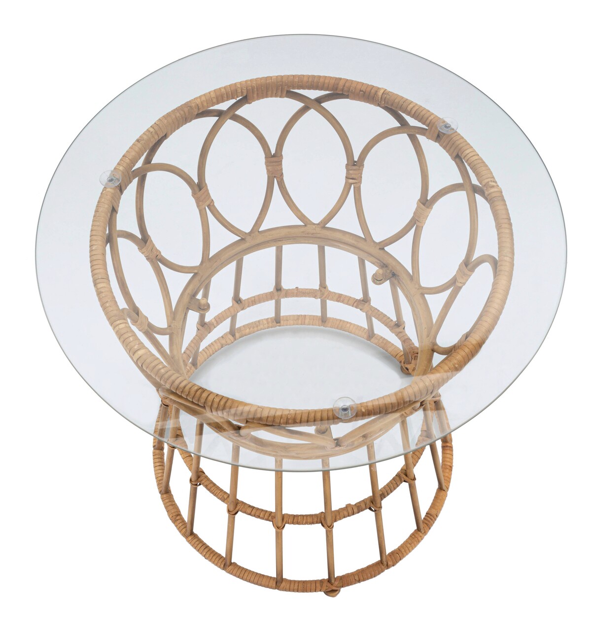 Masuta de cafea rotunda din metal cu finisaj din ratan si blat din sticla. Designul simplu si geometric o face potrivita pentru orice tip de mobilier.