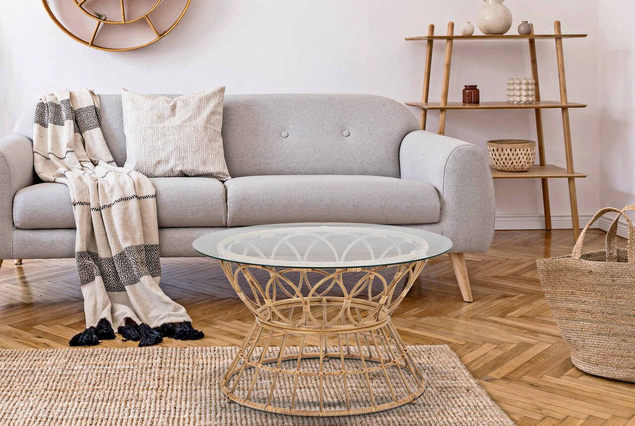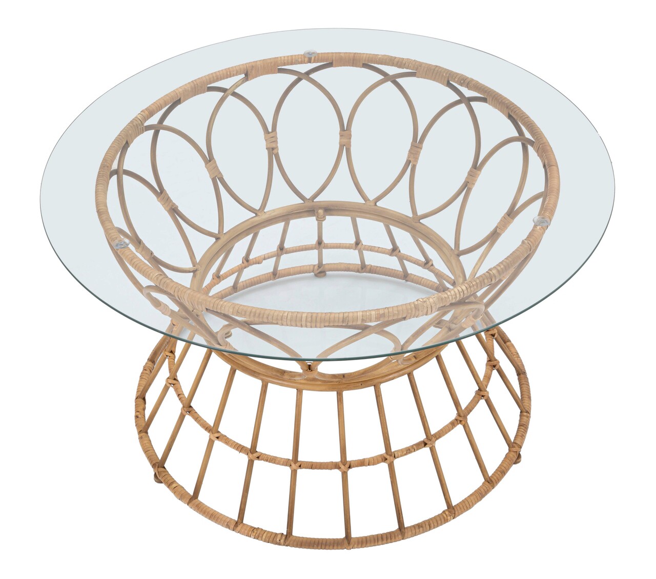 Masuta de cafea rotunda din metal cu finisaj din ratan si blat din sticla. Designul simplu si geometric o face potrivita pentru orice tip de mobilier.
