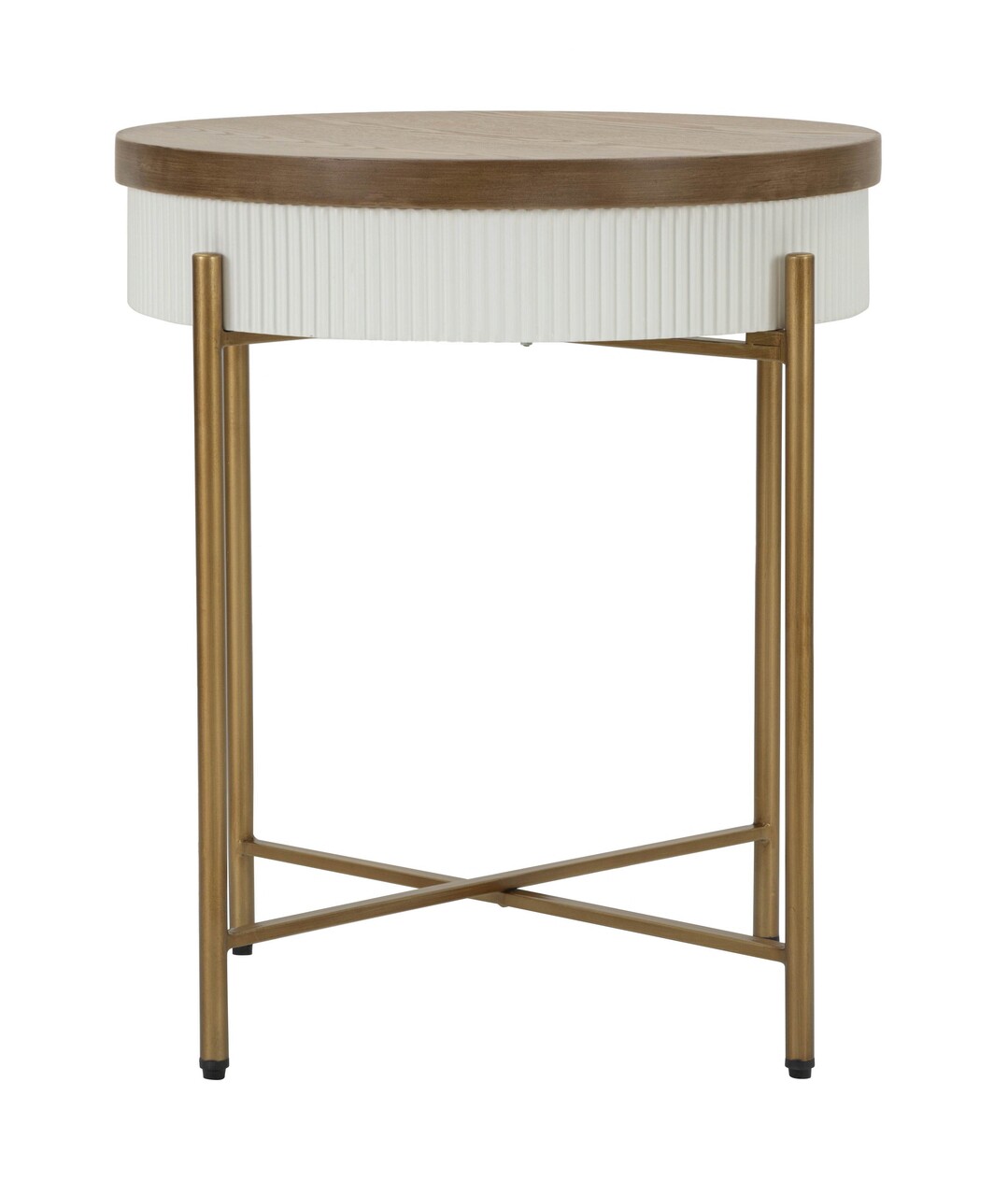Masuta rotunda din lemn alb si maro, decorata fin cu linii in relief. Produsul necesita asamblare. Compozitie material: MDF, lemn de frasin, fier.