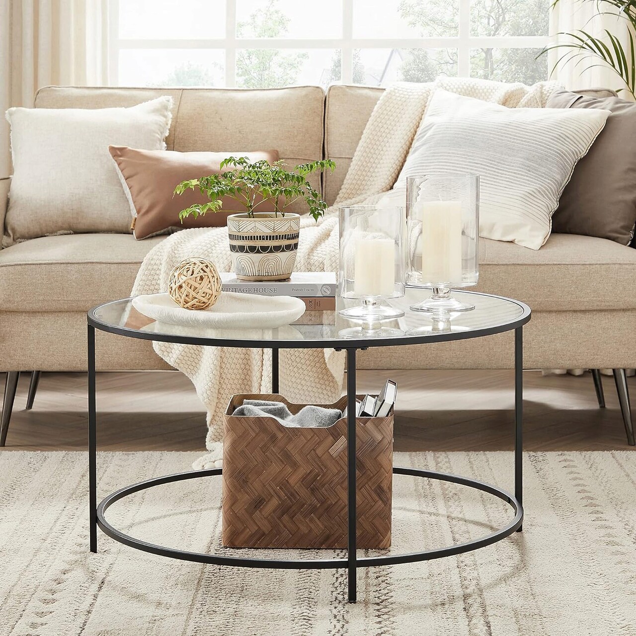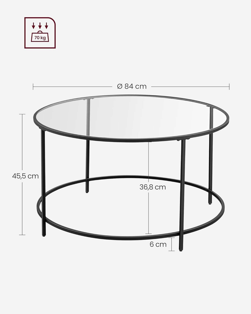 Masuta de cafea Vasagle, 84x84x45.5 cm, otel/sticla temperata, negru
