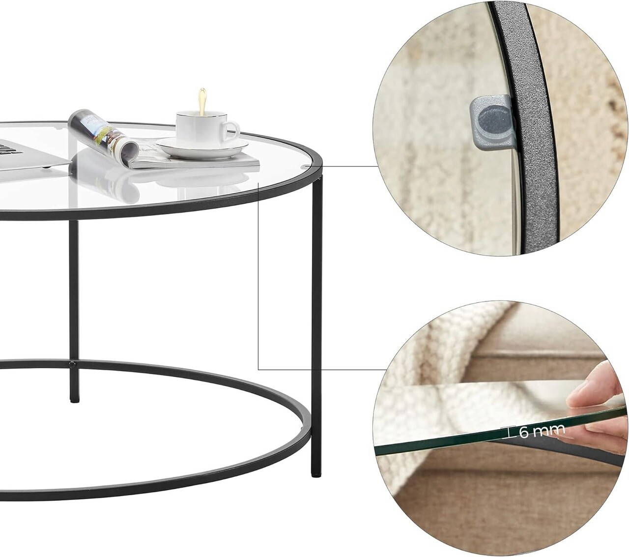 Stil si eleganta Un cadru rotunjit din otel de culoare neagra si un blat din sticla temperata - aceste doua elemente atragatoare se imbina pentru a crea o masuta de cafea moderna si eleganta.