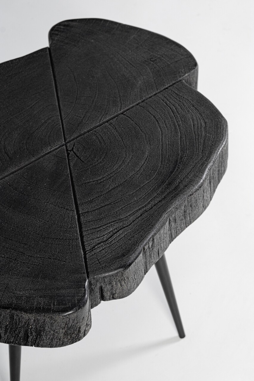 Partea superioara din lemn de salcam (sectiunea originala a trunchiului), finisare cu vopsea poliuretanica. Picioare din otel acoperite cu pulbere epoxidica. Formele si dimensiunile formate de lemn sunt doar orientative, toate articolele vor fi diferite intre ele. Produsul necesita asamblarea picioarelor.