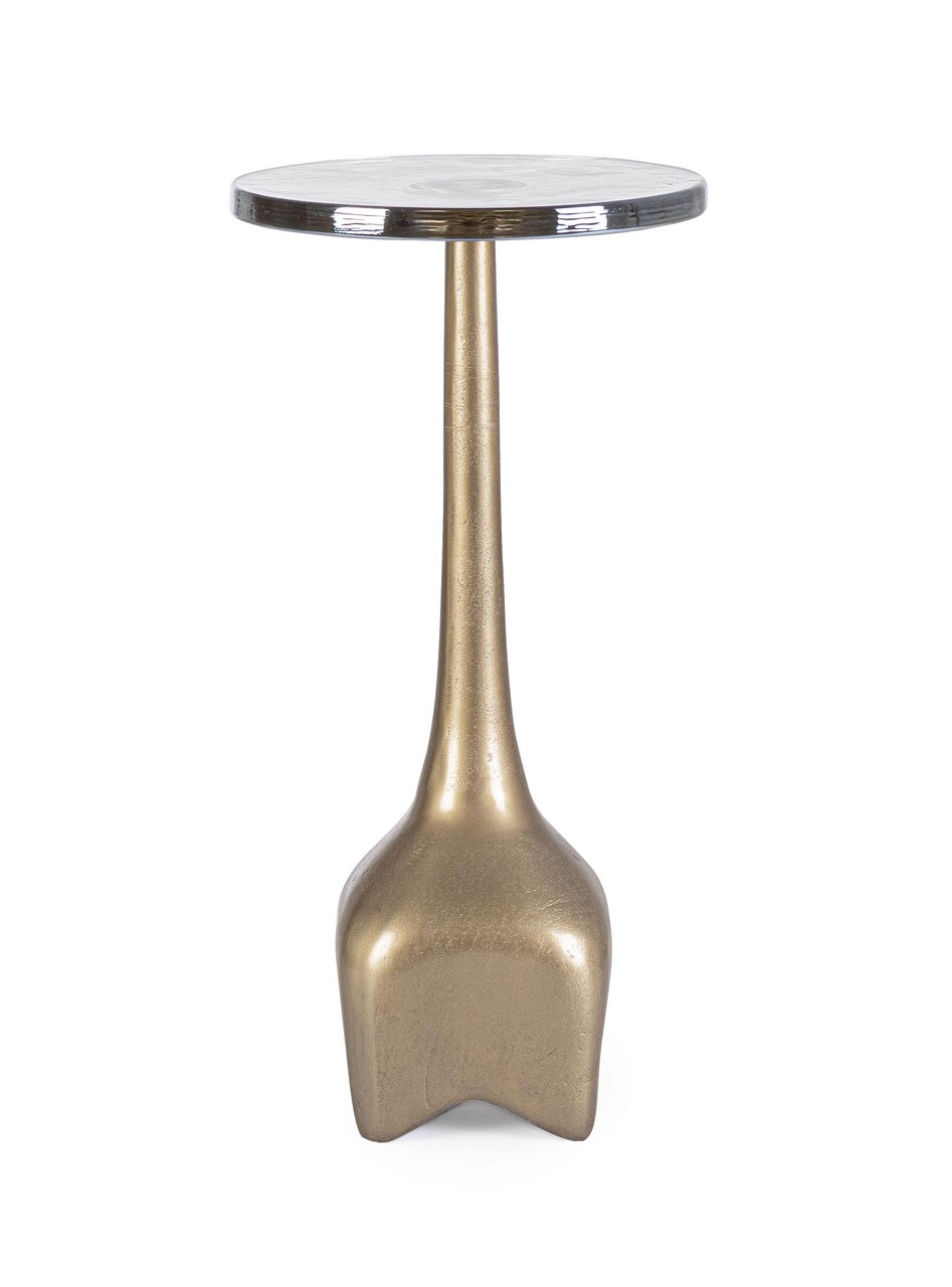 Aluminiu cu finisaj placat si antichizat. Blat din sticla naturala realizat manual (grosime 15-18 mm). Formele originale formate de sticla sunt doar orientative, toate articolele vor fi diferite unele de altele, cu dimensiuni si culori usor diferite.