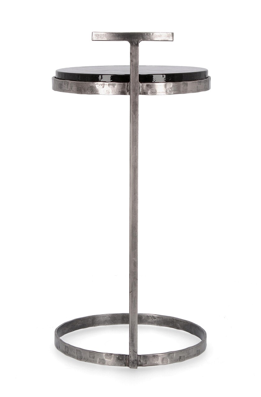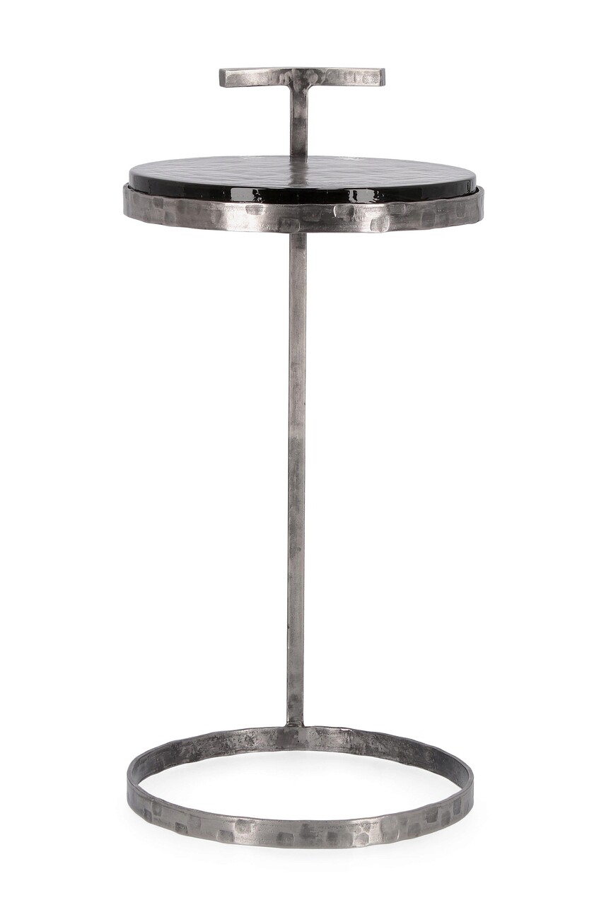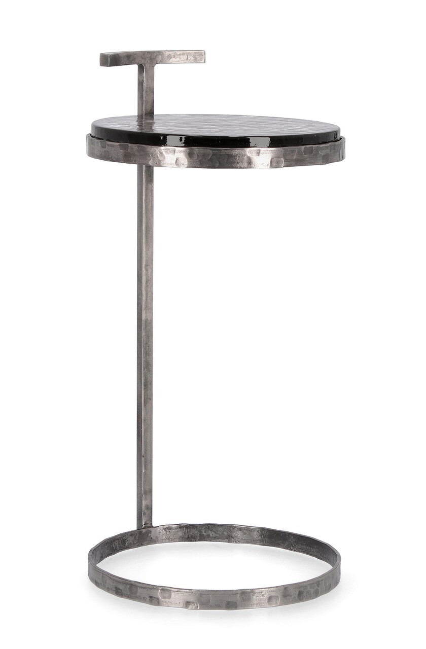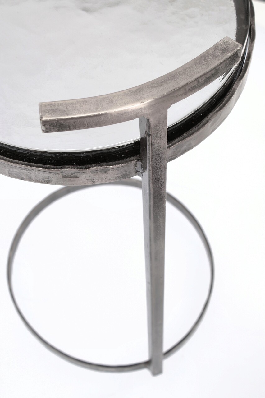 Otel cu finisaj batut cu ciocanul, placat si antichizat. Blat din sticla naturala realizat manual (grosime 15-18 mm). Formele originale formate de sticla sunt doar orientative, toate articolele vor fi diferite unele de altele, cu dimensiuni si culori usor diferite.
