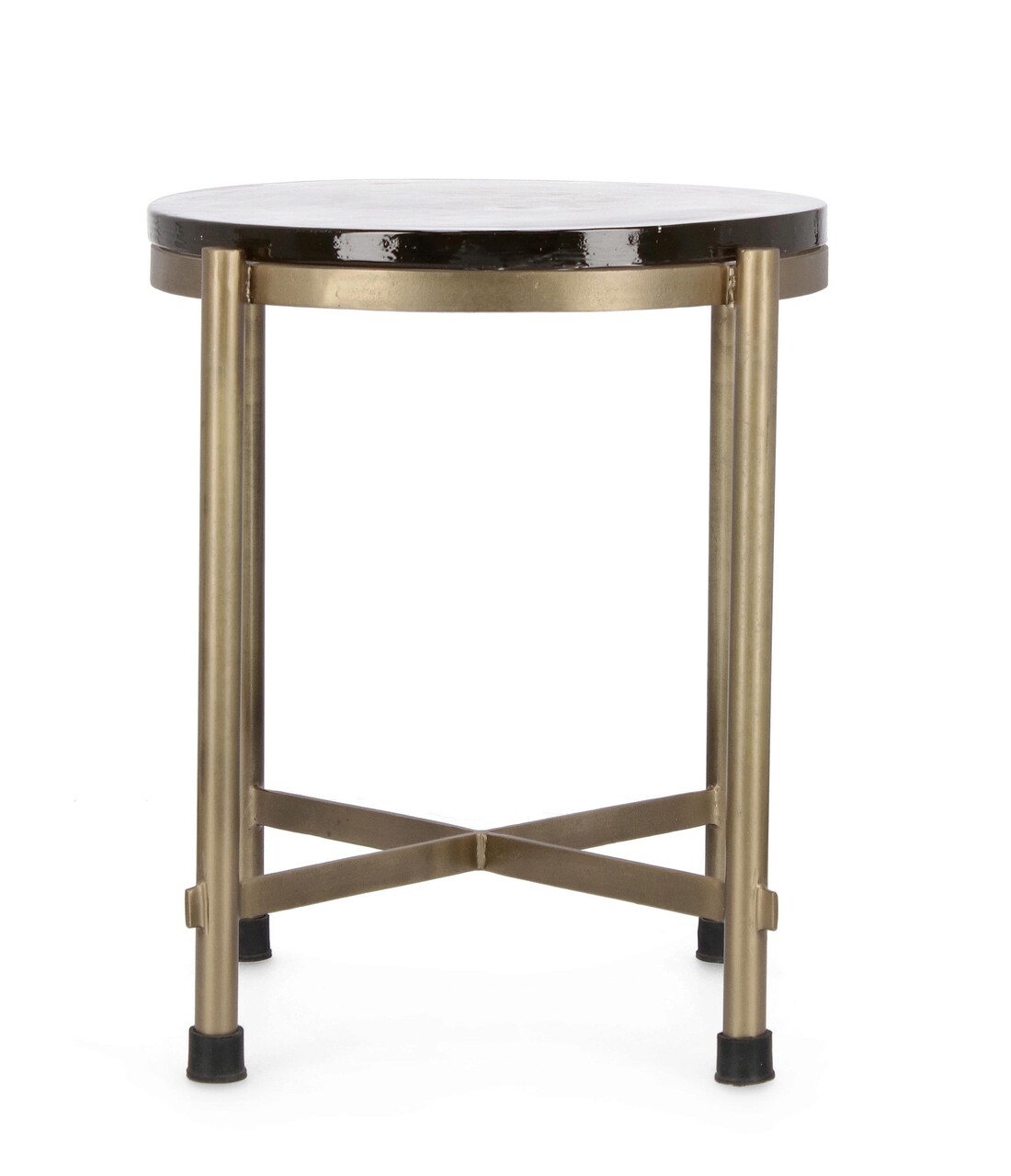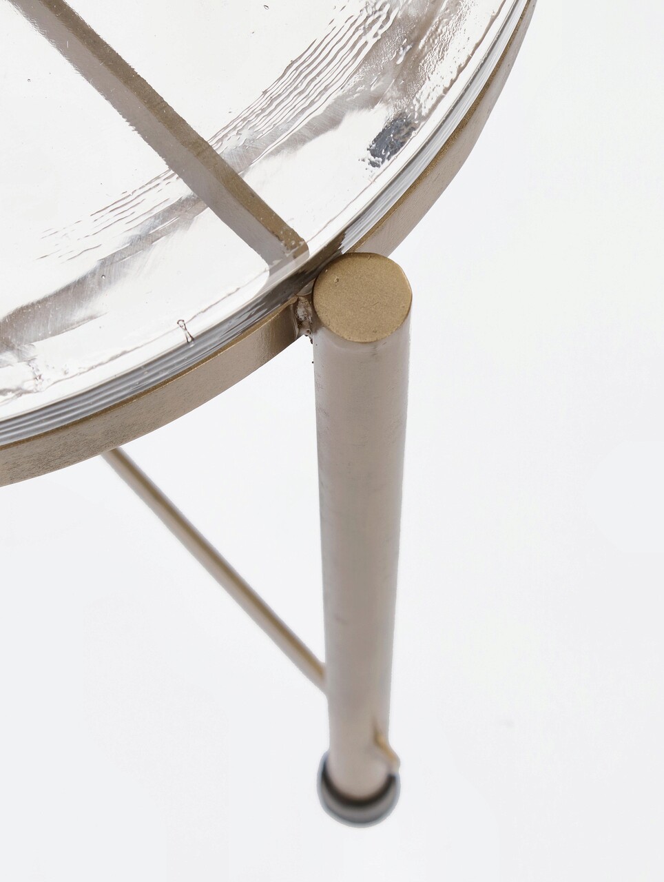 Otel cu finisaj placat si antichizat. Blat din sticla naturala realizat manual (grosime 15-18 mm). Formele originale formate de sticla sunt doar orientative, toate articolele vor fi diferite unele de altele, cu dimensiuni si culori usor diferite.