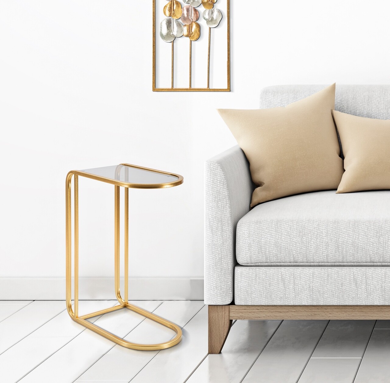 Masa de colt cu structura metalica aurie cu linii moi si rotunjite si blat din sticla
