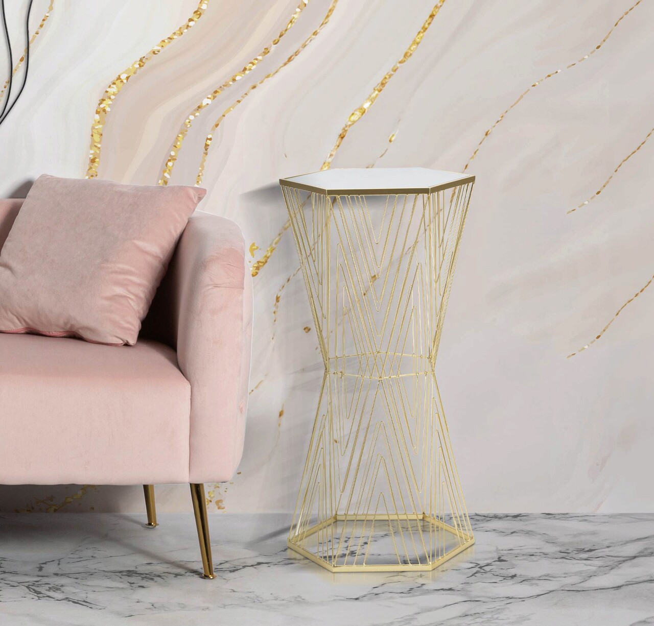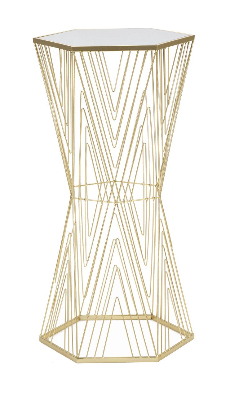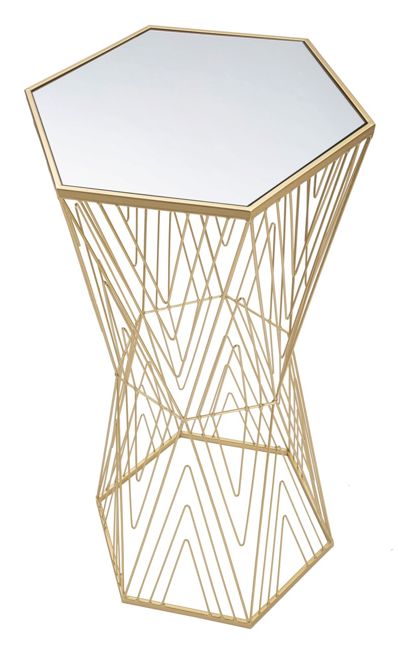 Masa hexagonala din metal auriu cu linii geometrice care creeaza un decor perfect. Completata cu blat din sticla oglindita.