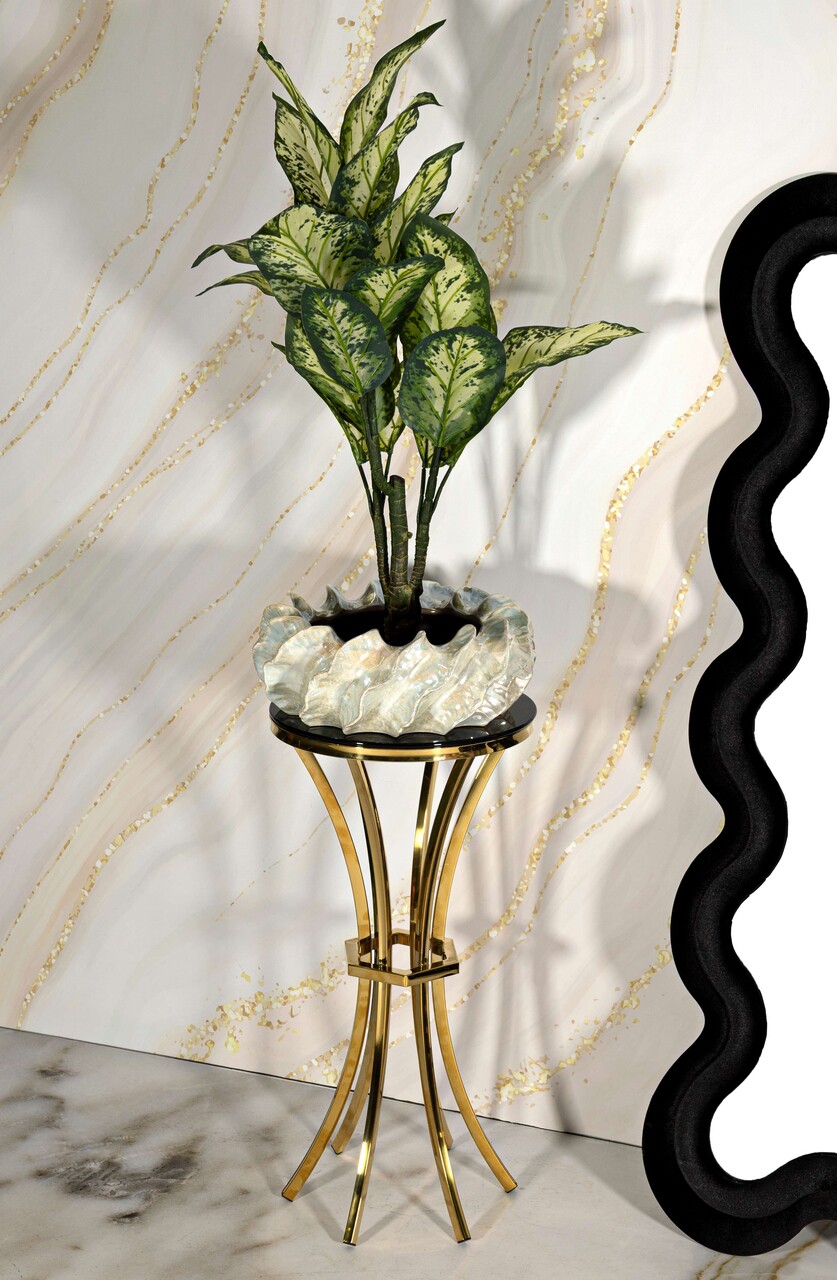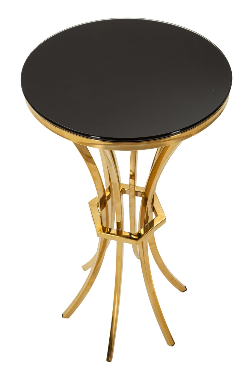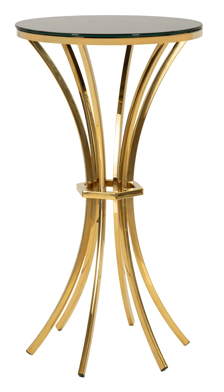 Picioare aurii subtiri si blat din sticla transparenta pentru un plus de eleganta si luminozitate. Un complement decorativ ideal in spatii rafinate.