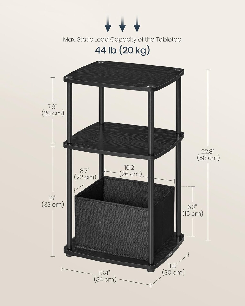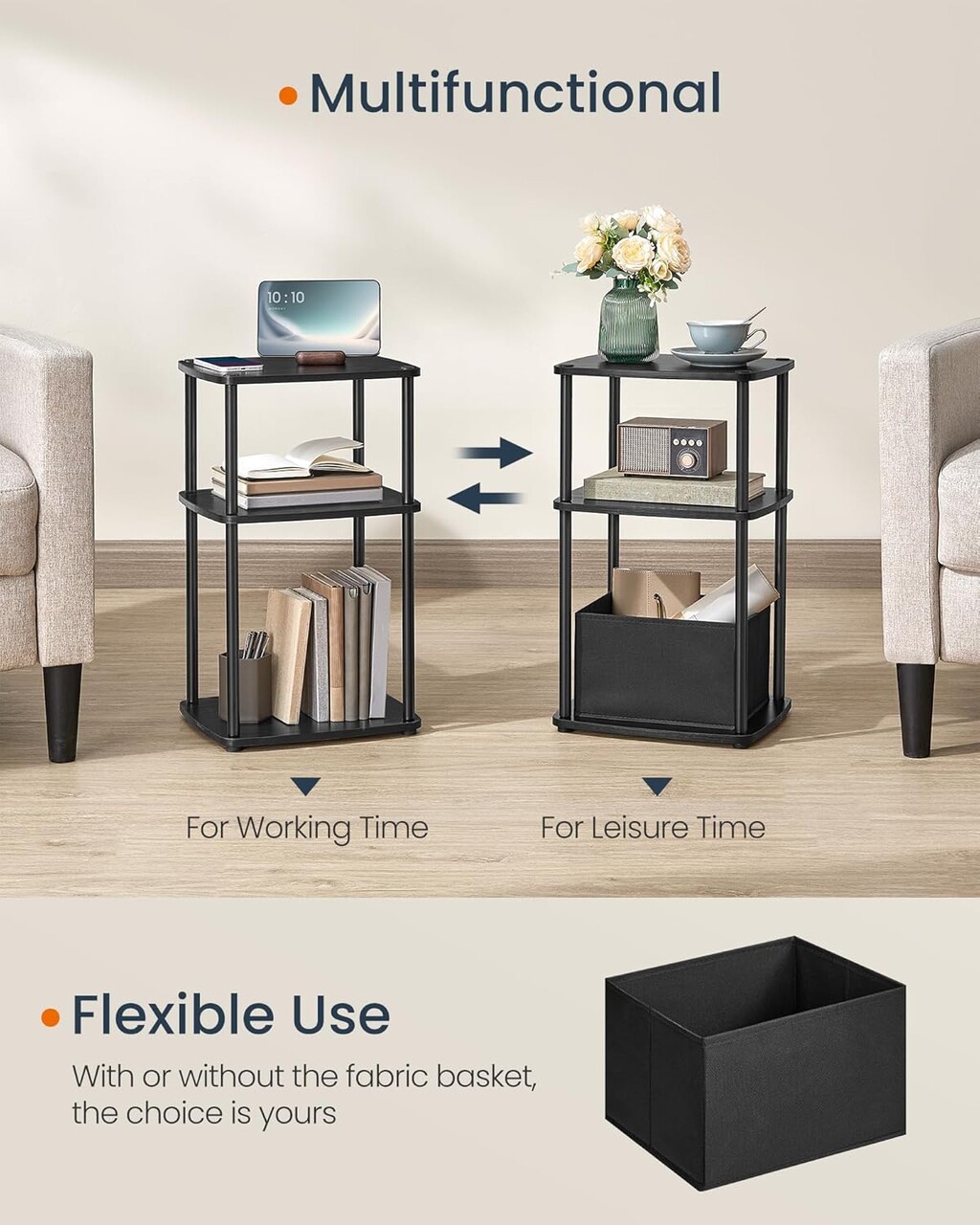 Depozitare generoasa Cu 3 rafturi si un cos textil suplimentar, aceasta masuta laterala ofera un spatiu generos de depozitare - o solutie de depozitare ideala pentru lucrurile dvs. marunte!