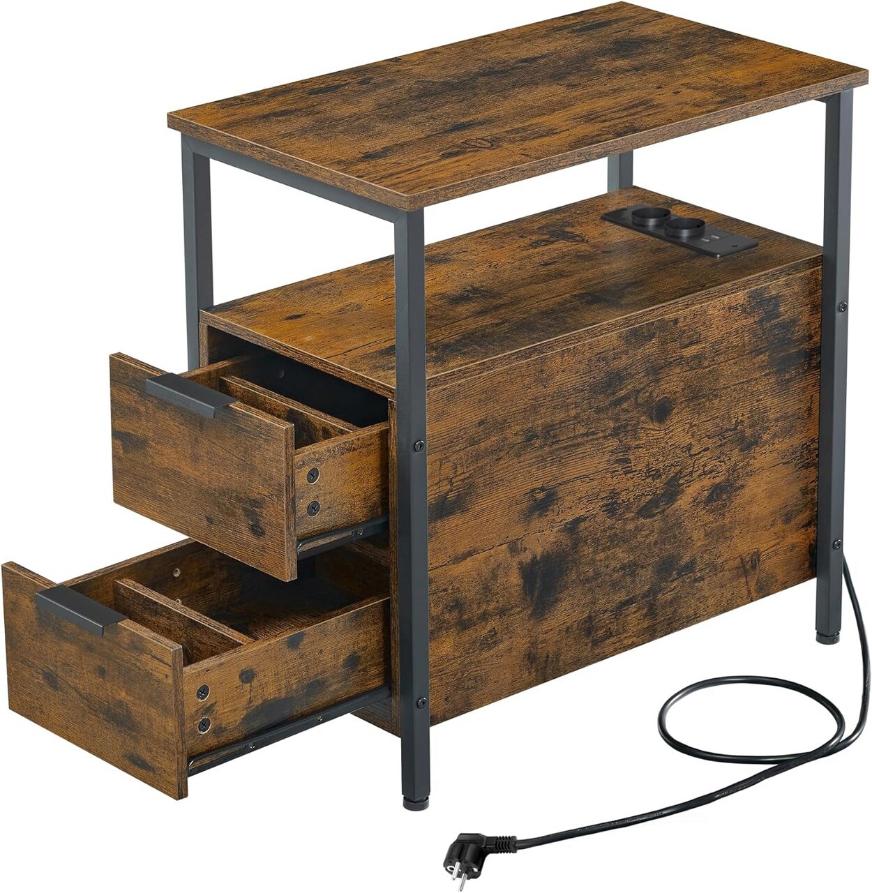 Masuta laterala cu priza si USB / noptiera cu 2 sertare, Vasagle, 60 x 35 x 61 cm, PAL/otel, maro rustic