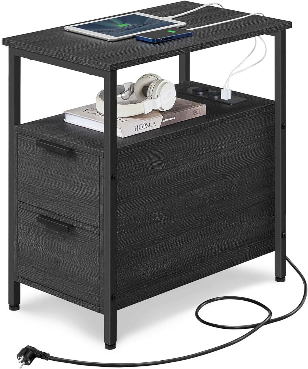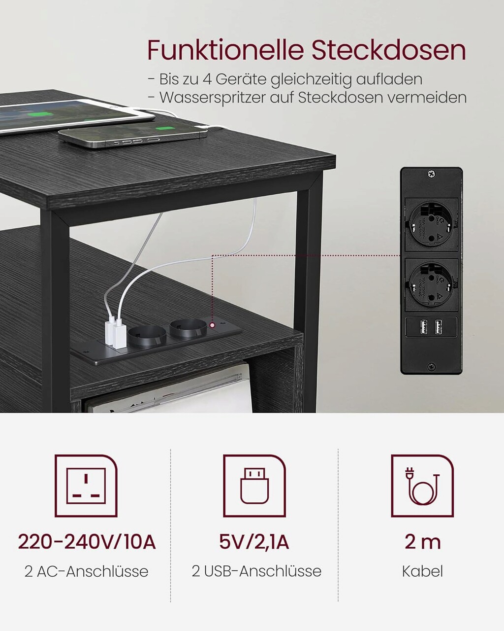 Masuta laterala cu priza si USB / noptiera cu 2 sertare, Vasagle, 60 x 35 x 61 cm, PAL/otel, negru
