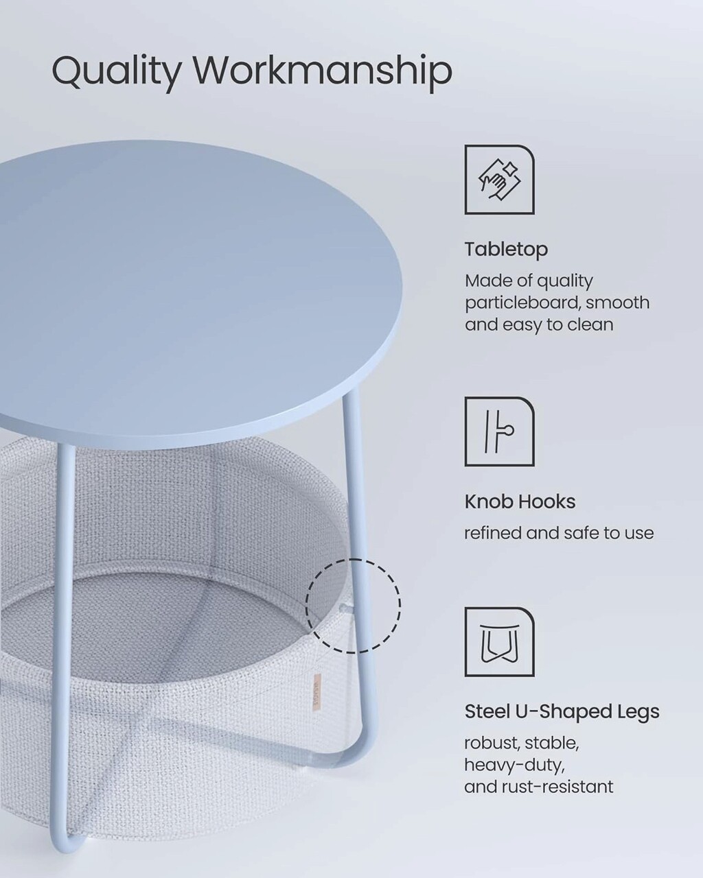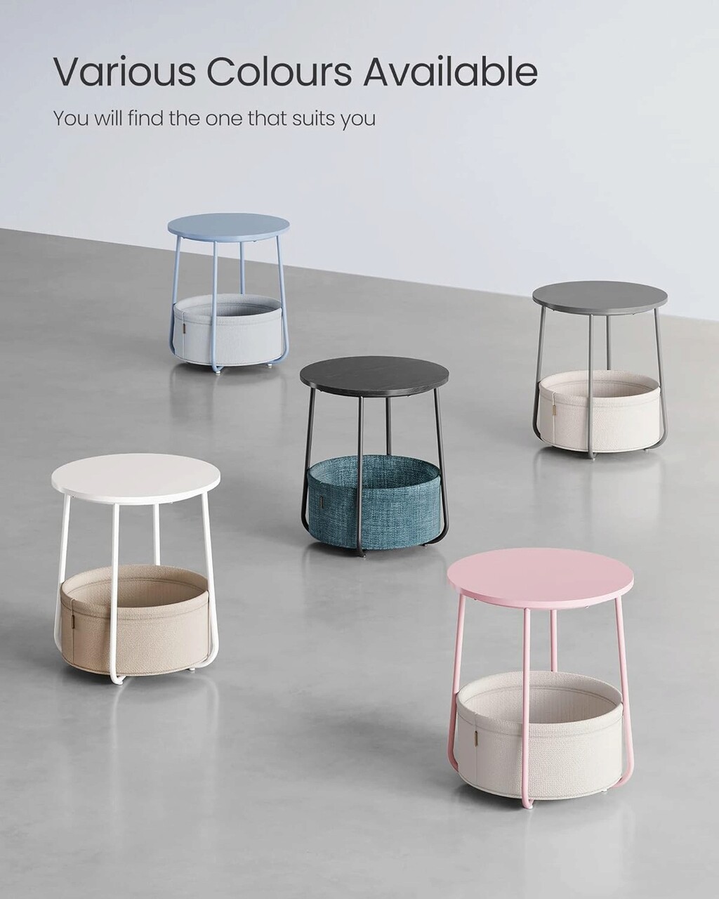 Masuta cu cos textil Vasagle se potriveste ca masuta laterala in camera de zi sau ca noptiera in dormitor, nu este voluminoasa, dar ofera suficient spatiu de depozitare pentru obiectele dvs. Blatul robust din PAL este fixat pe cadru fara sa se clatine. Picioarele din otel in forma de U dintr-o singura bucata ofera un suport solid. Picioarele reglabile sporesc stabilitatea si nu zgarie podeaua. Cosul din tesatura de poliester cu doua straturi, fara cute, are un design placut si nu contine substante chimice. Greutate maxima suportata pentru blat: 35 kg.