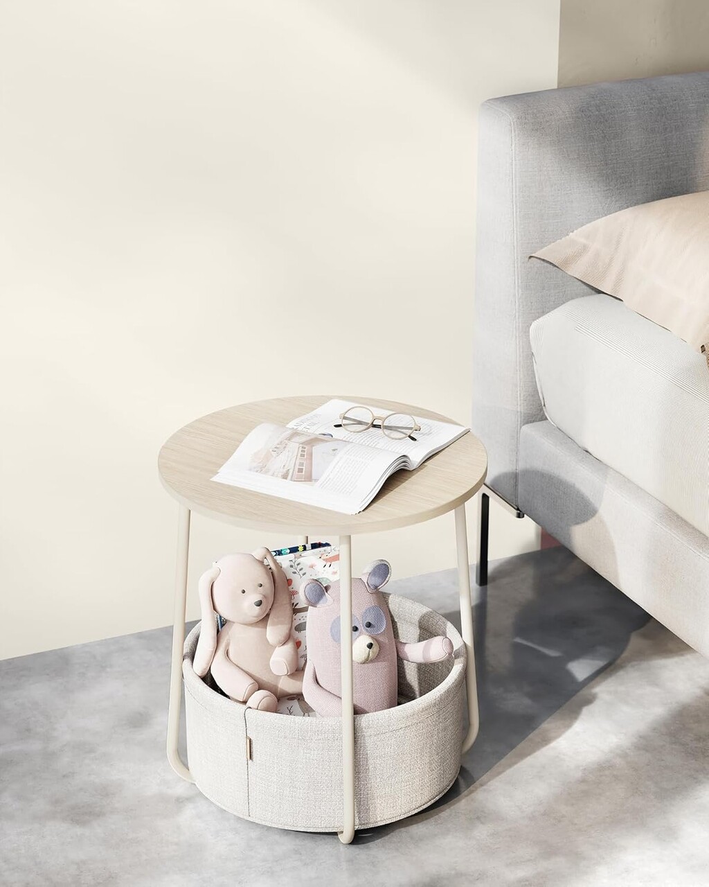 Masuta cu cos textil Vasagle se potriveste ca masuta laterala in camera de zi sau ca noptiera in dormitor, nu este voluminoasa, dar ofera suficient spatiu de depozitare pentru obiectele dvs. Blatul robust din PAL este fixat pe cadru fara sa se clatine. Picioarele din otel in forma de U dintr-o singura bucata ofera un suport solid. Picioarele reglabile sporesc stabilitatea si nu zgarie podeaua. Cosul din tesatura de poliester cu doua straturi, fara cute, are un design placut si nu contine substante chimice. Greutate maxima suportata pentru blat: 35 kg.