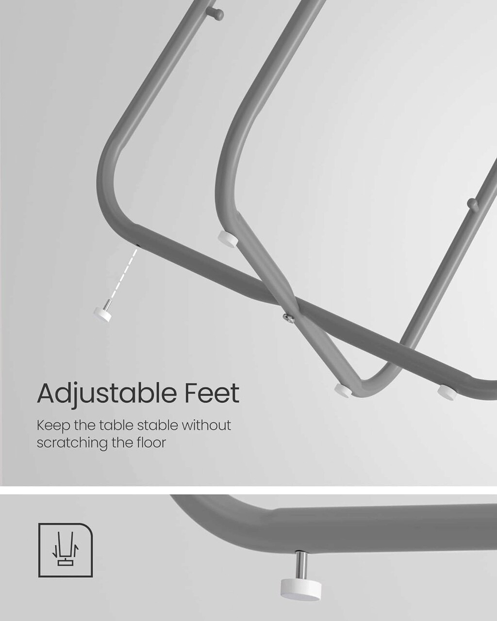 Masuta cu cos textil Vasagle se potriveste ca masuta laterala in camera de zi sau ca noptiera in dormitor, nu este voluminoasa, dar ofera suficient spatiu de depozitare pentru obiectele dvs. Blatul robust din PAL este fixat pe cadru fara sa se clatine. Picioarele din otel in forma de U dintr-o singura bucata ofera un suport solid. Picioarele reglabile sporesc stabilitatea si nu zgarie podeaua. Cosul din tesatura de poliester cu doua straturi, fara cute, are un design placut si nu contine substante chimice. Greutate maxima suportata pentru blat: 35 kg.