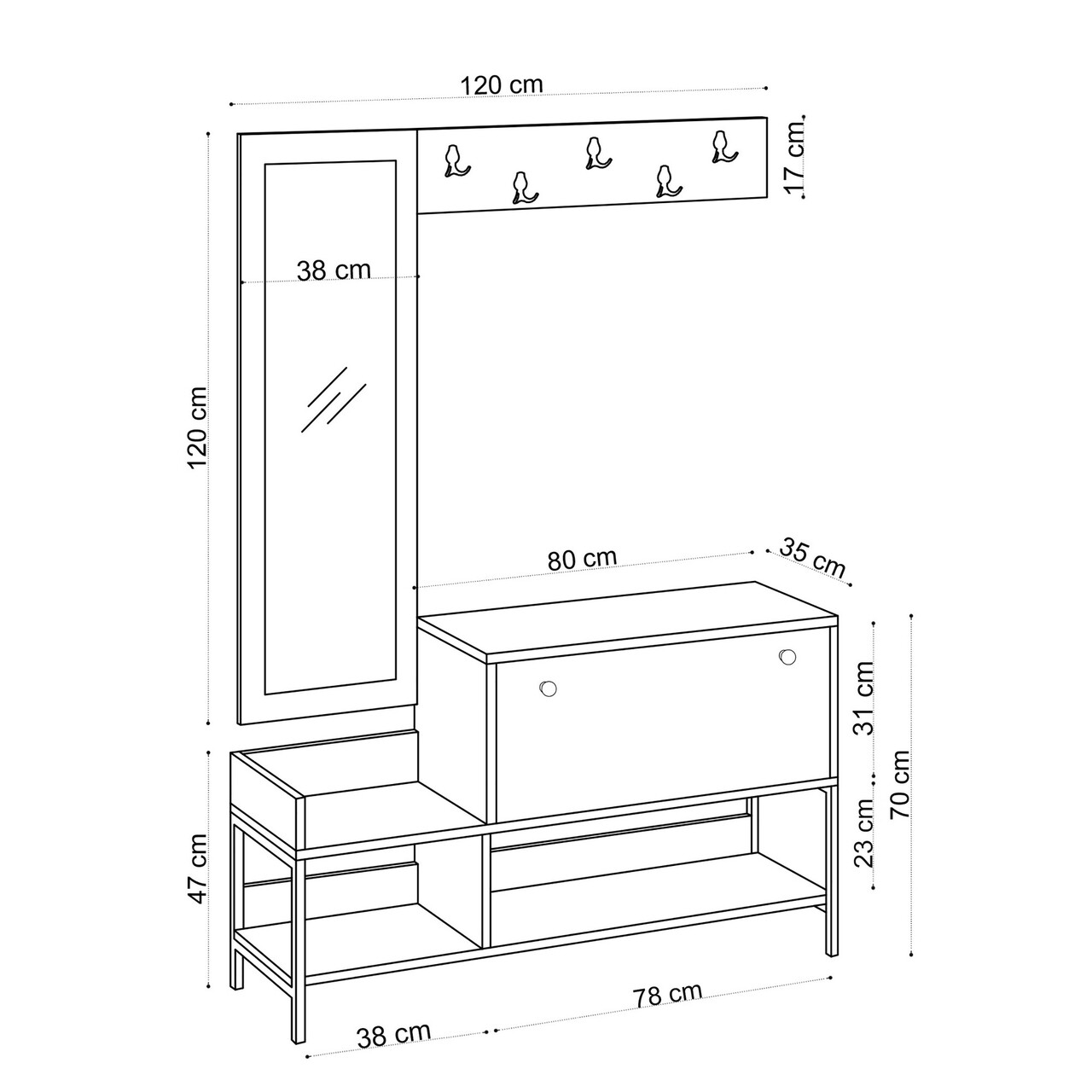 Setul este format din pantofar: 78 x 35 x 116 cm (Lxlxh), cuier cu oglinda: 120 x 120 cm (Lxh).