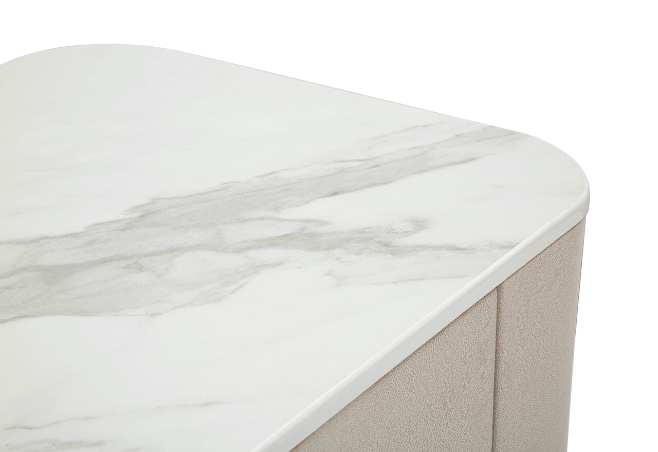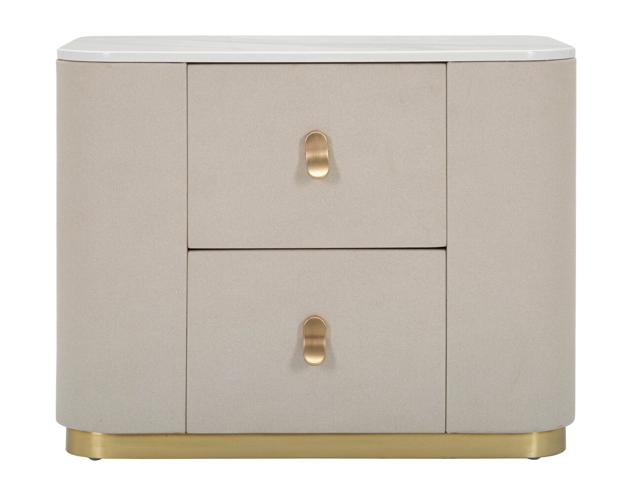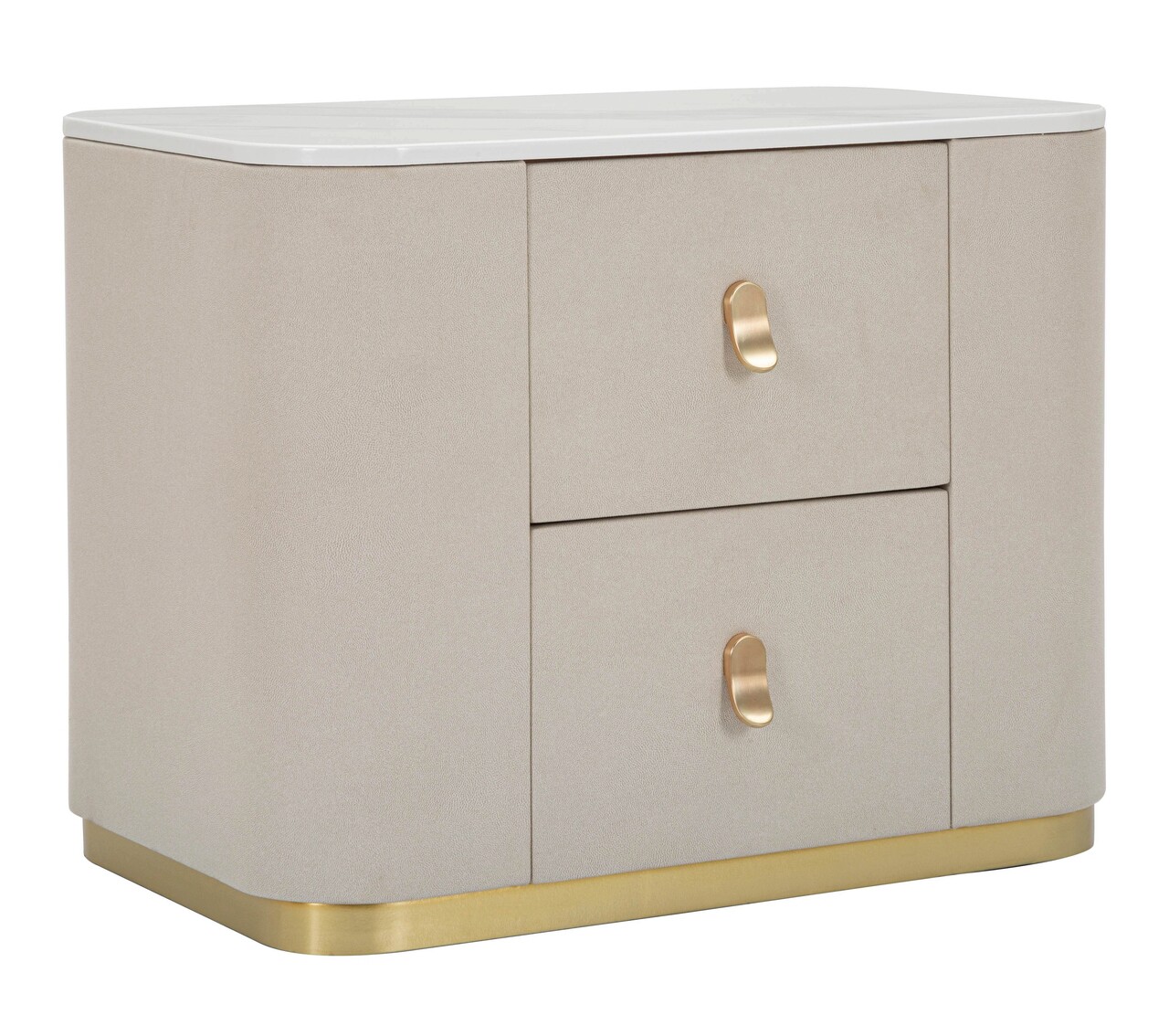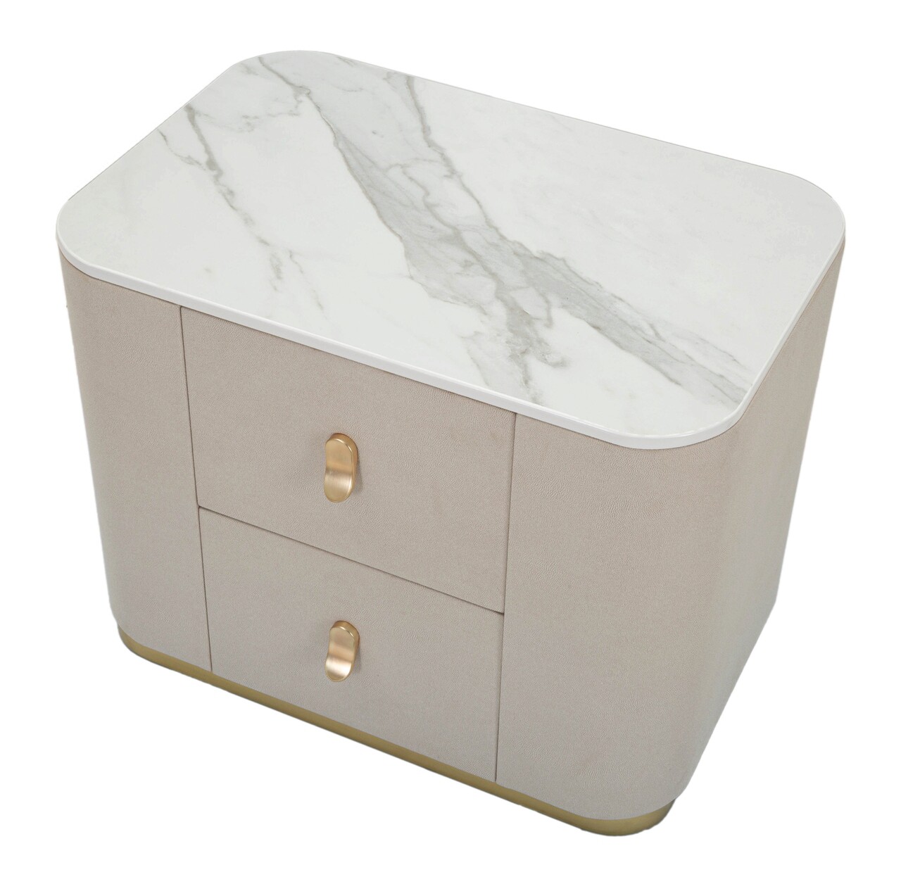 Noptiera din material textil alb cu blat din imitatie de marmura, cu 2 sertare. Manerele si finisajele aurii ii confera o nota de eleganta. Dimensiuni sertare: 25.5 x 28 x 11 cm. Compozitie material: lemn de pin, MDF, metal.