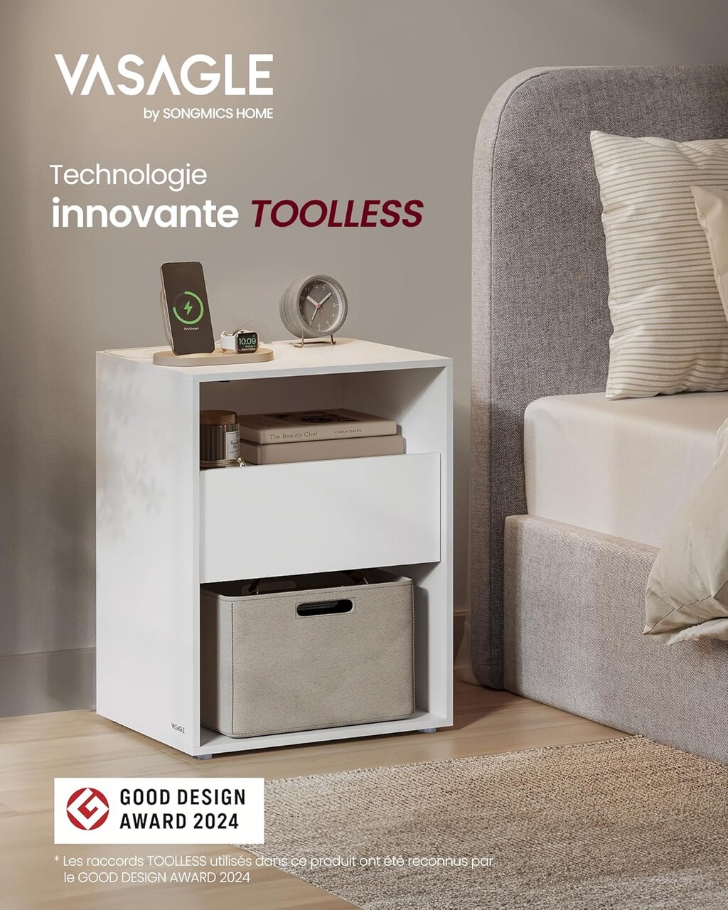 Noptiera cu priza si USB incorporate, Vasagle, 45x35x58.3 cm, PAL, asamblare fara unelte, alb mat