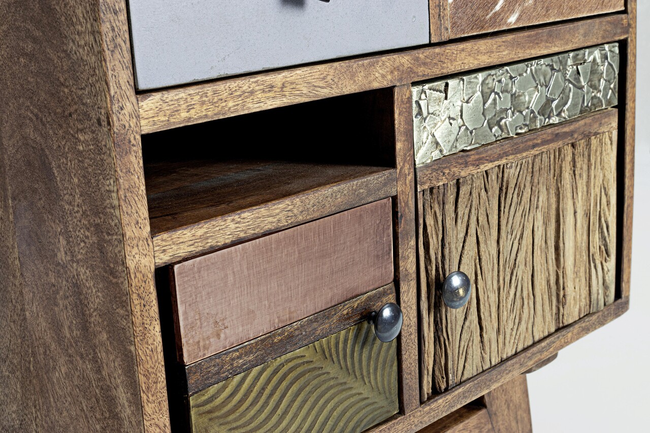 Usi si sertare frontale din mango si salcam reciclat cu aplicatii din metal si piele.