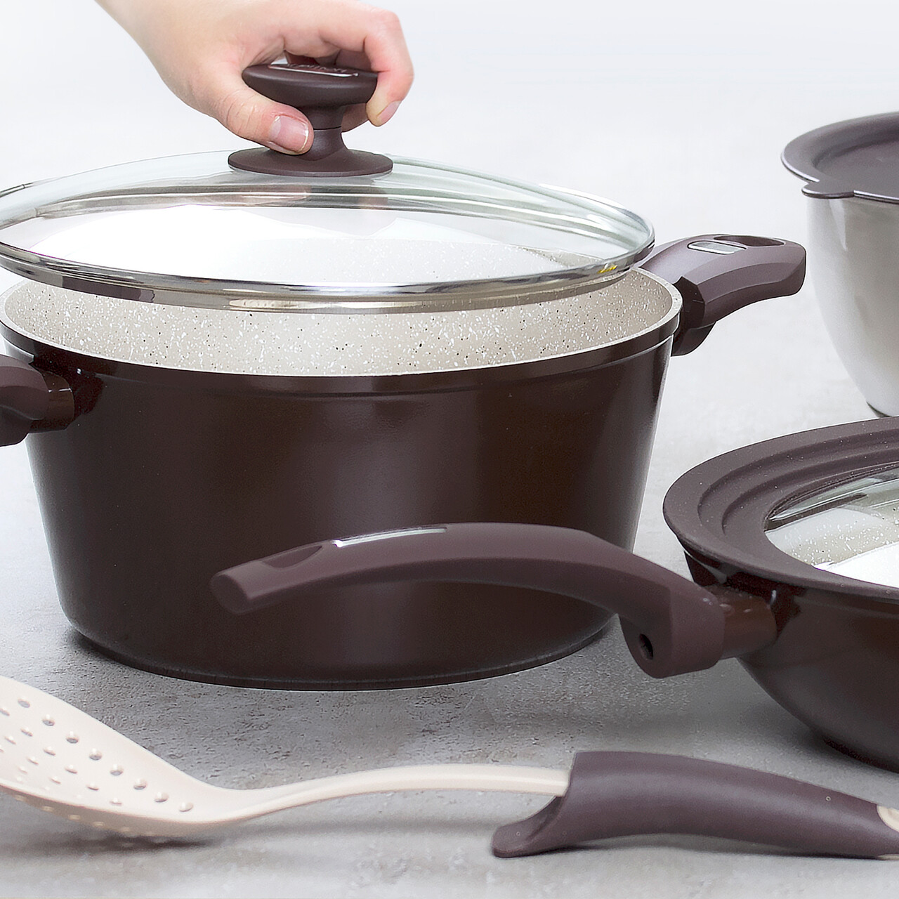 Oala din aluminiu forjat, cu invelis Qualum Basic Stone Edition, care imita aspectul pietrei. Rezistenta ridicata la deformari si zgarieturi, si capac din sticla temperata. Potrivita pentru toate tipurile de aragazuri, inclusiv cu inductie.