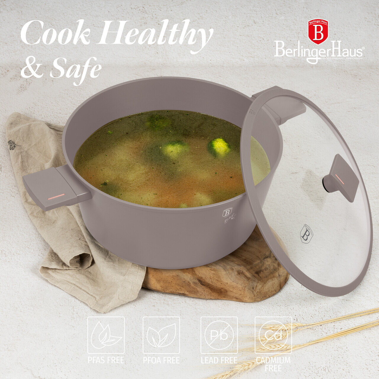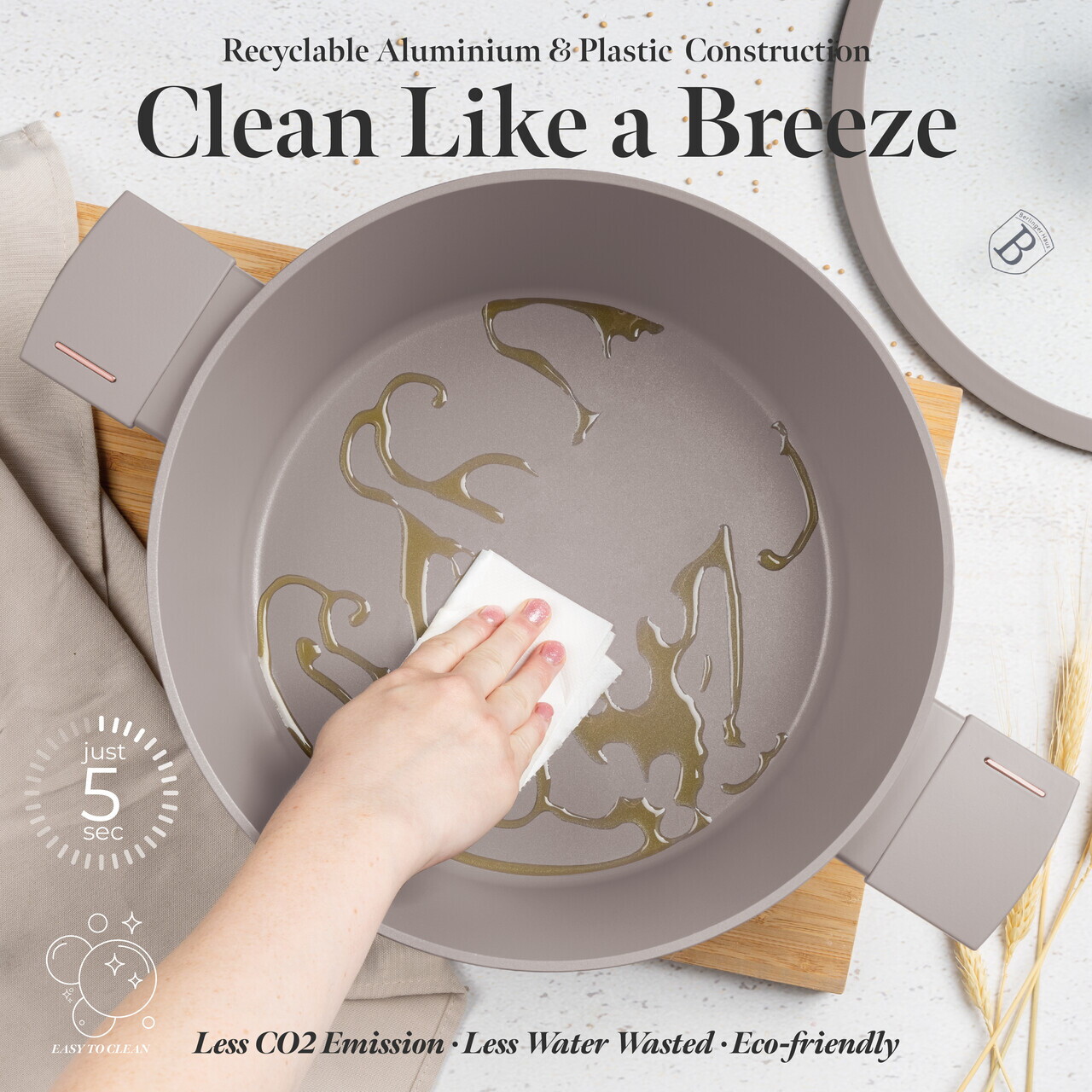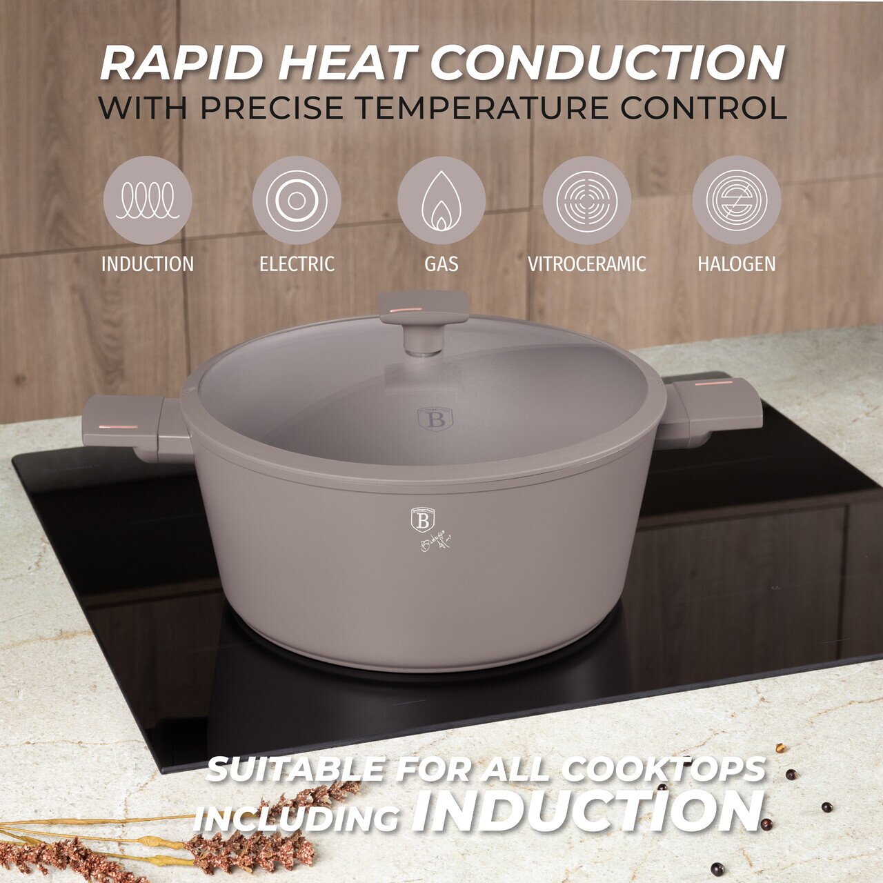 Oala cu capac Berlinger Haus, Taupe, 30 cm, 8 L, aluminiu forjat, taupe mat