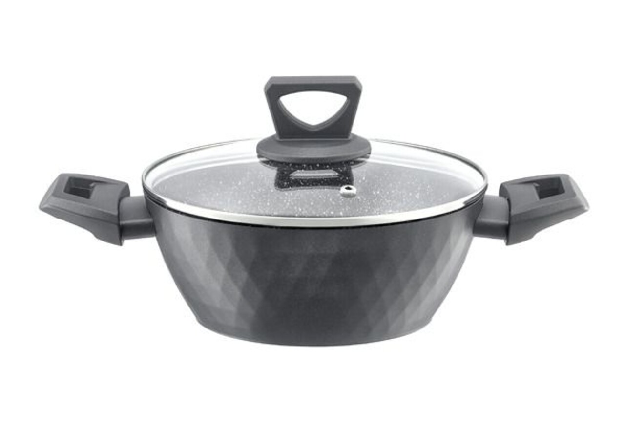 Oala cu capac, din aluminiu, cu invelis Qualum Basic Stone Edition. Vasele Diamond au un aspect unic, care imita piatra, oferind o combinatie a rusticului cu modernul, pastrand insa eleganta prin nuanta neutra, potrivita in orice bucatarie. Aluminiul permite transmiterea caldurii in mod eficient, ceea ce face gatitul mult mai rapid, si deci mai economic. Invelisul in interiorul oalei o face foarte rezistenta la zgarieturi, iar manerele soft-touch si confortabile, asigurand o prindere usoara. Acestea pot fi folosite pe orice tip de aragaz, inclusiv cele cu inductie.