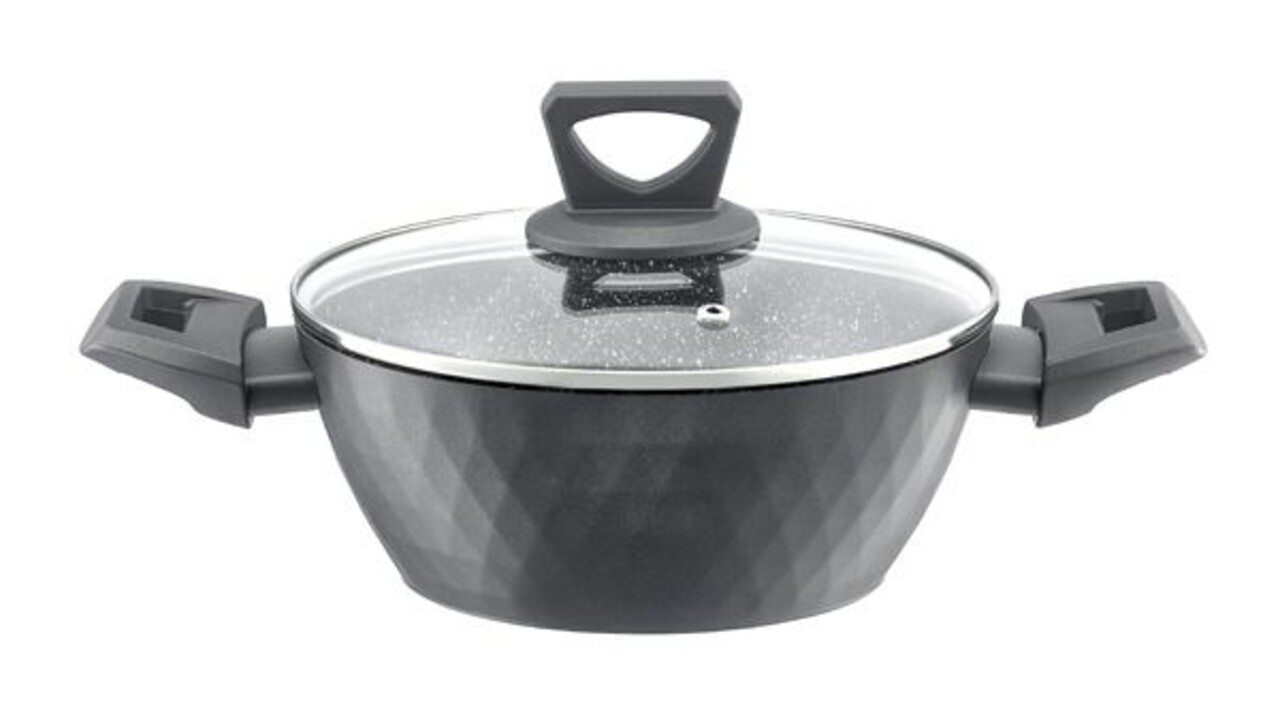 Oala cu capac, din aluminiu, cu invelis Qualum Basic Stone Edition. Vasele Diamond au un aspect unic, care imita piatra, oferind o combinatie a rusticului cu modernul, pastrand insa eleganta prin nuanta neutra, potrivita in orice bucatarie. Aluminiul permite transmiterea caldurii in mod eficient, ceea ce face gatitul mult mai rapid, si deci mai economic. Invelisul in interiorul oalei o face foarte rezistenta la zgarieturi, iar manerele soft-touch si confortabile, asigurand o prindere usoara. Acestea pot fi folosite pe orice tip de aragaz, inclusiv cele cu inductie.