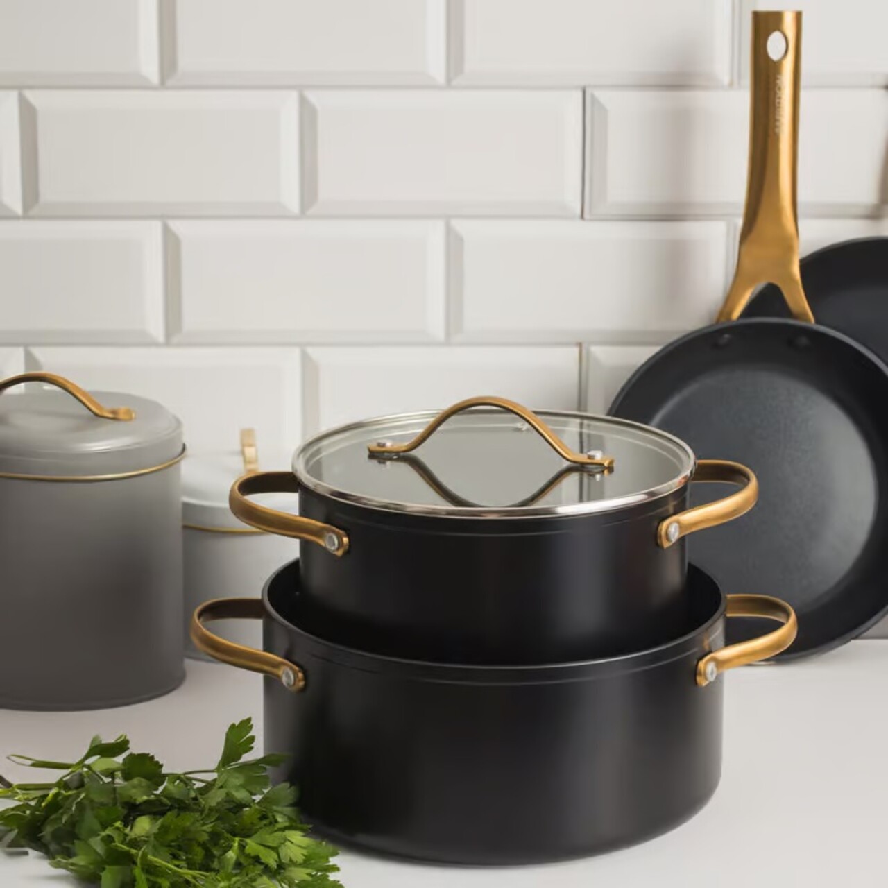 Colectia de vase pentru gatit Ambition Royal reprezinta o combinatie de eleganta, functionalitate si calitate superioara. Negrul clasic, elegant, o forma simpla, moderna si manerele aurii constituie o combinatie neobisnuita care introduce o nota de lux in bucatarie. Oalele si tigaile Royal sunt fabricate din aluminiu forjat, care este rezistent la incordare si deformare, asigurand o durata lunga de viata a produsului. In plus, aluminiul forjat se incalzeste uniform si acumuleaza perfect caldura, facand gatitul mai economic. Manerele confortabile din otel PVD auriu se potrivesc perfect in maini. La interior, oalele si tigaile sunt acoperite cu un strat antiaderent de inalta calitate Qualum Basic. Qualum Basic este un strat de acoperire cu proprietati antiaderente semnificative si rezistenta ridicata la abraziune. Vasele cu acoperire antiaderenta sunt foarte usor de curatat. Oalele si tigaile Royal includ un fund gros cu inductie si sunt potrivite pentru utilizare pe toate tipurile de aragaz, inclusiv pe cele cu inductie. Se pot folosi si la cuptor pana la 220°C.
