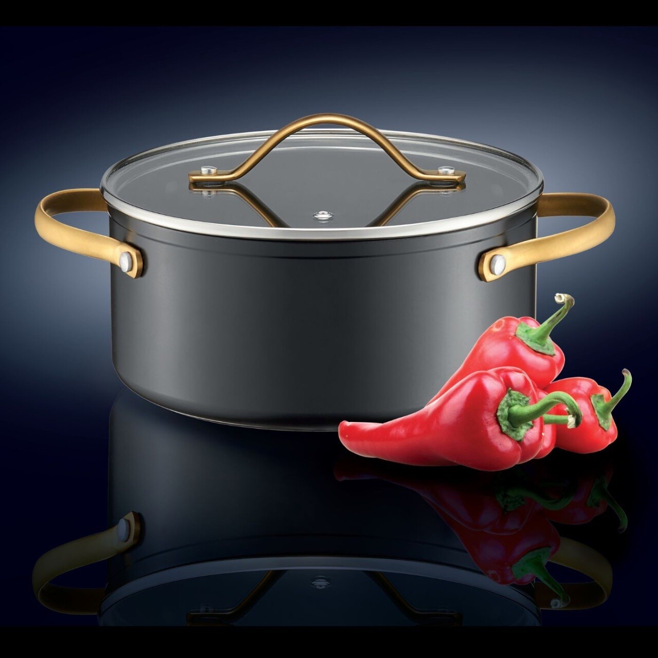 Oala cu capac Royal Gold, Ambition, 28 cm, 7.5 L, aluminiu forjat, strat antiaderent Qualum Basic, gri/auriu